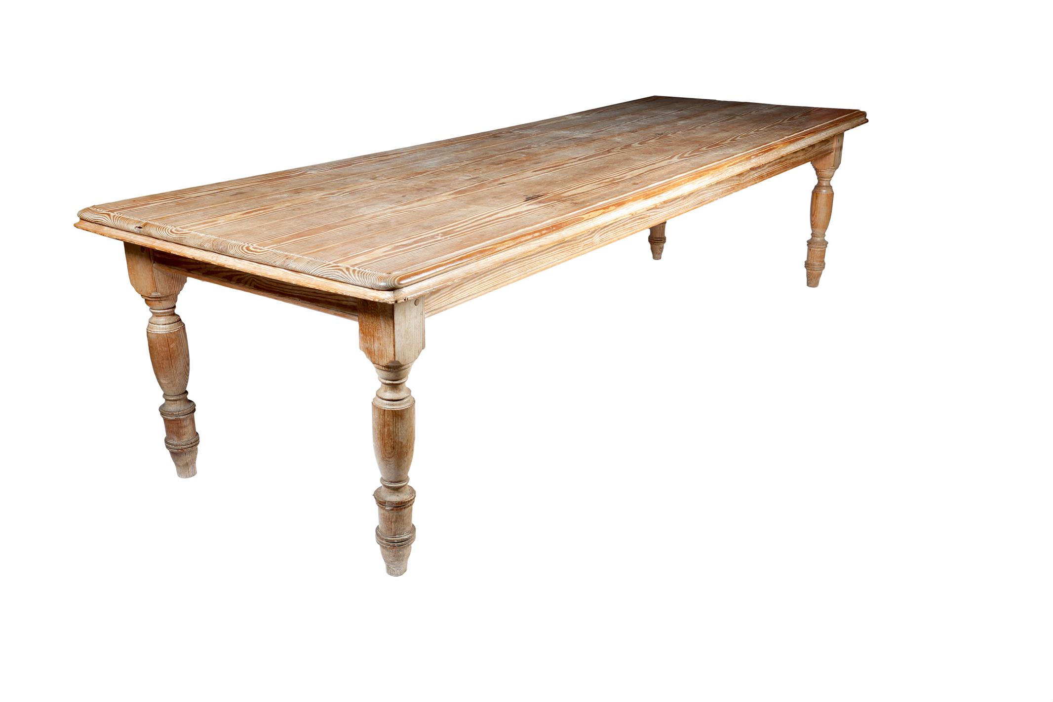 A large Victorian pitch pine farmhouse kitchen table, the detachable top with a moulded edge on turned and tapering legs, 77.4cm high, 306.5cm long, 105.5cm deep.