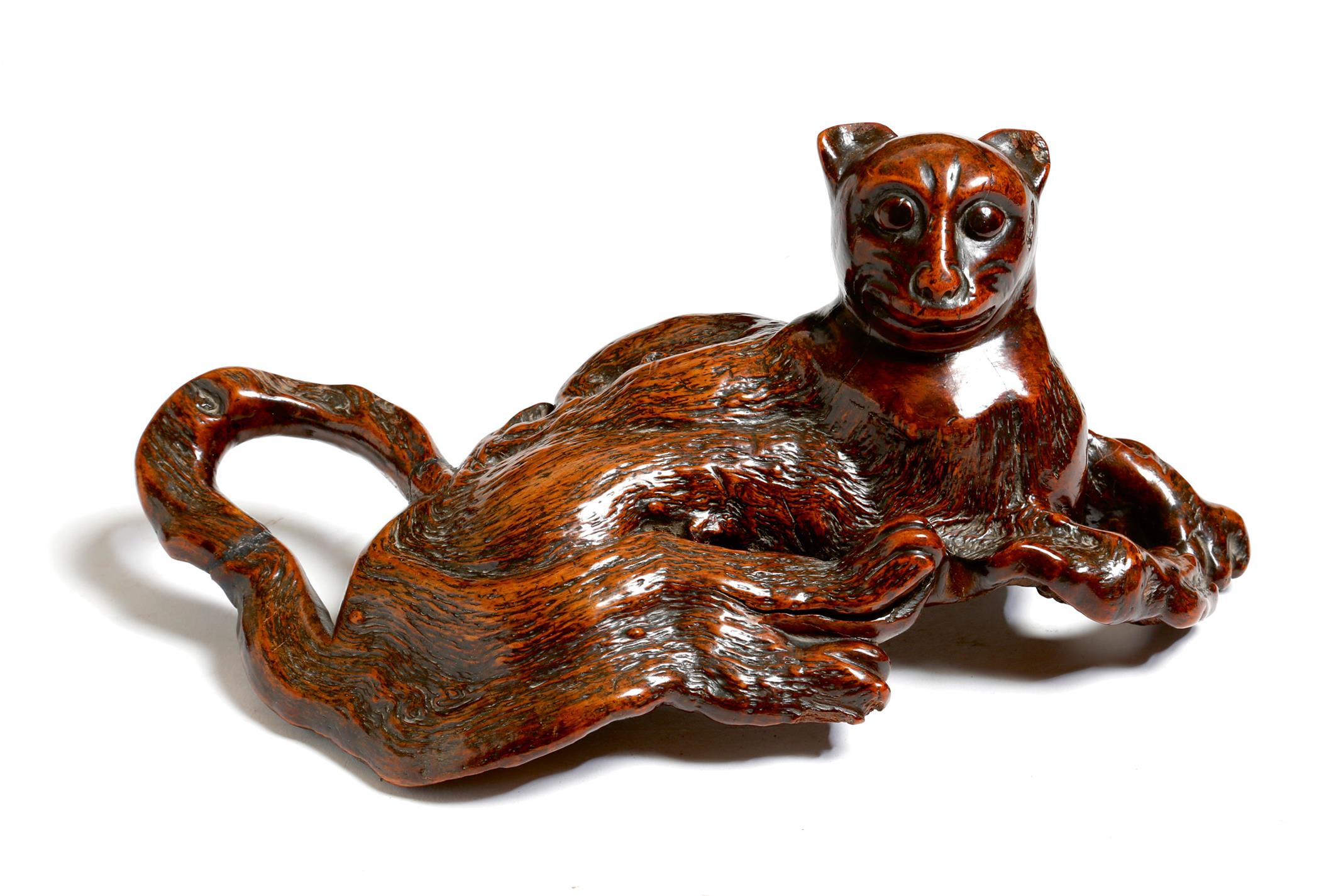 A Japanese rootwood carving of a recumbent cat