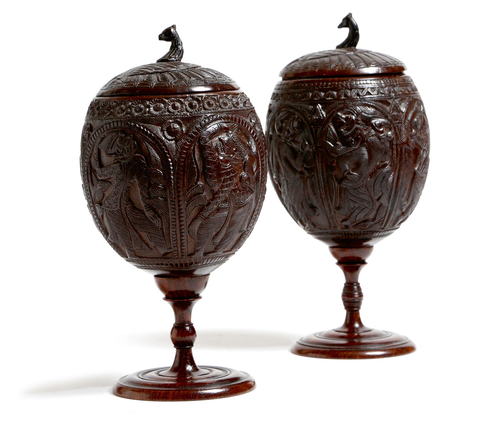 λ Two similar Indian carved coconut cups and covers, each decorated with a peacock and panels of figures, on a turned rosewood base, 19th century, 19.4cm high (max). (2)