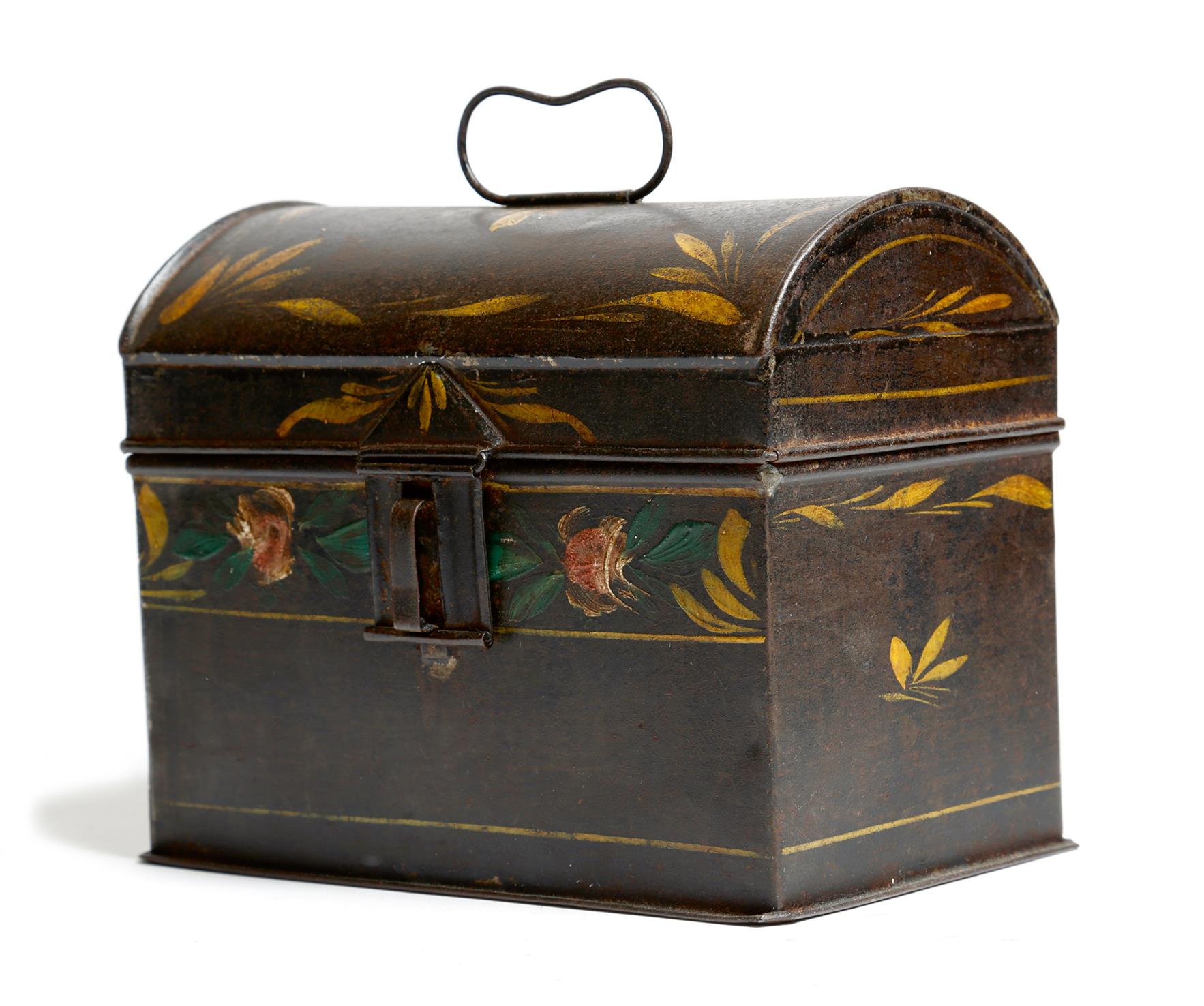 A 19th century tôle box, painted with flowers and leaves, the domed lid with a handle, probably American, 18.5cm high, 19.6cm wide.