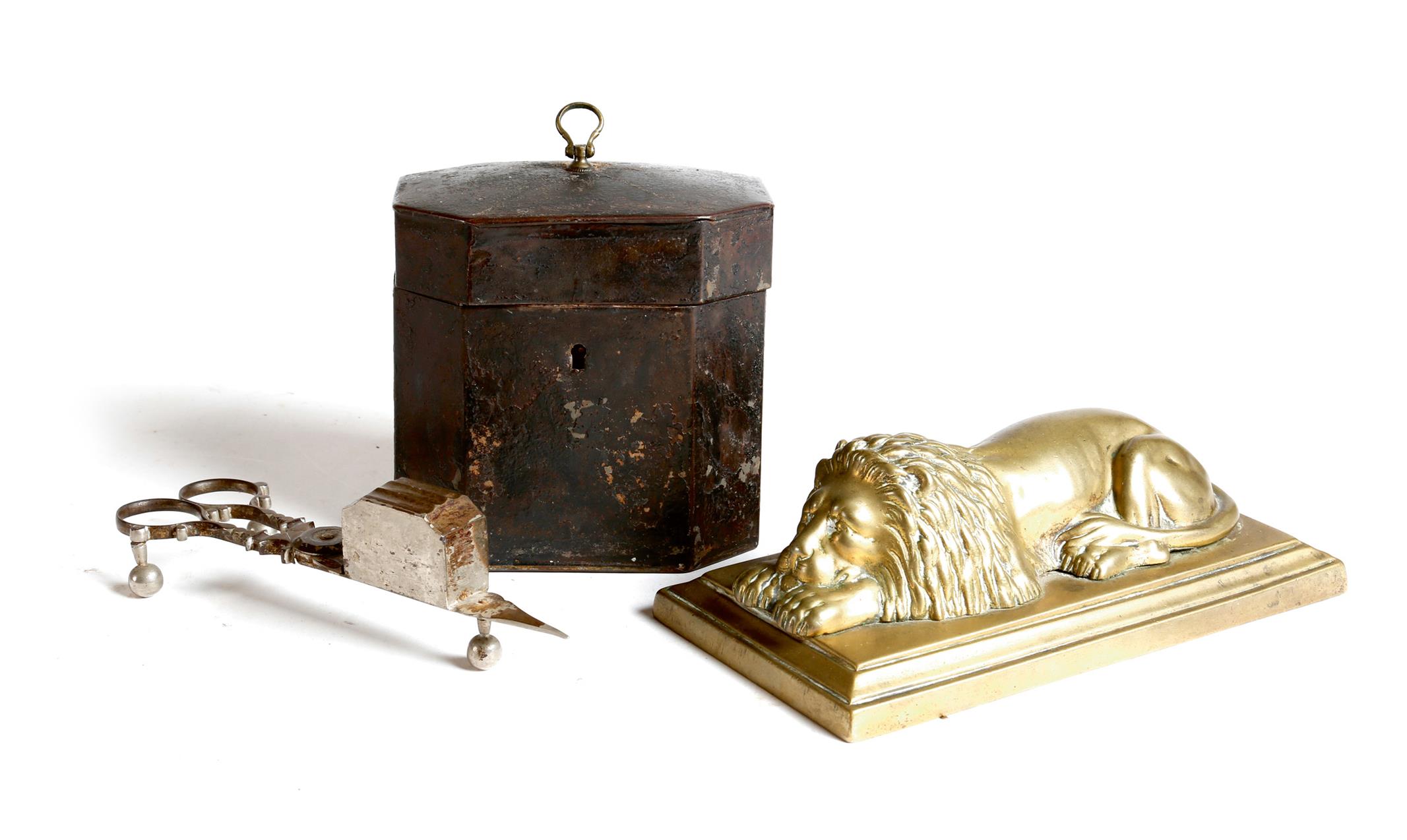 An early 19th century tôle tea caddy, a brass paperweight in the form of a recumbent lion and a pair of steel candle snuffers, 19.5cm wide (max). (3)