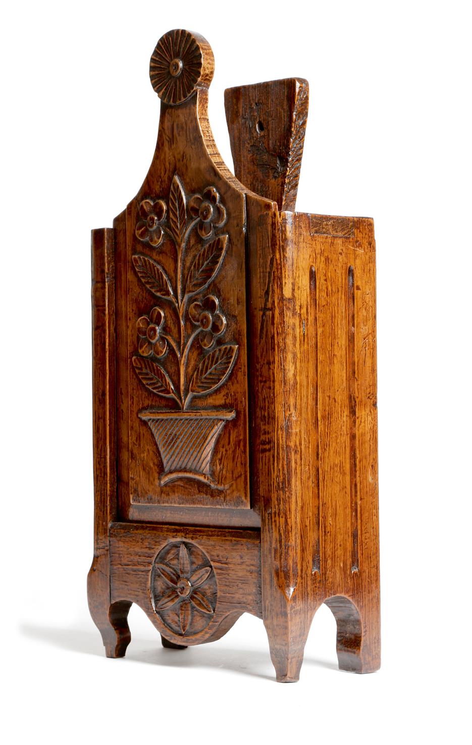 A French provincial chestnut candle box, the sliding cover carved with an urn of flowers, late 18th / early 19th century, 44.5cm high, 20cm wide, 9.8cm deep.