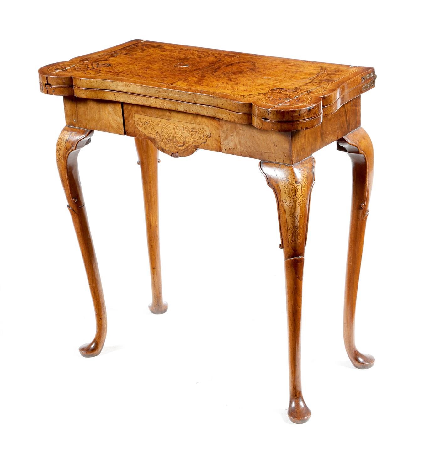 An early 18th century walnut and seaweed marquetry card table, the crossbanded fold-over top inlaid with stringing and burr panels, revealing a plush fabric lined playing surface with dished counter wells and marquetry candlestands, with a frieze drawer on hocked cabriole legs and pad feet, 71.6cm high, 72cm wide, 36cm deep.