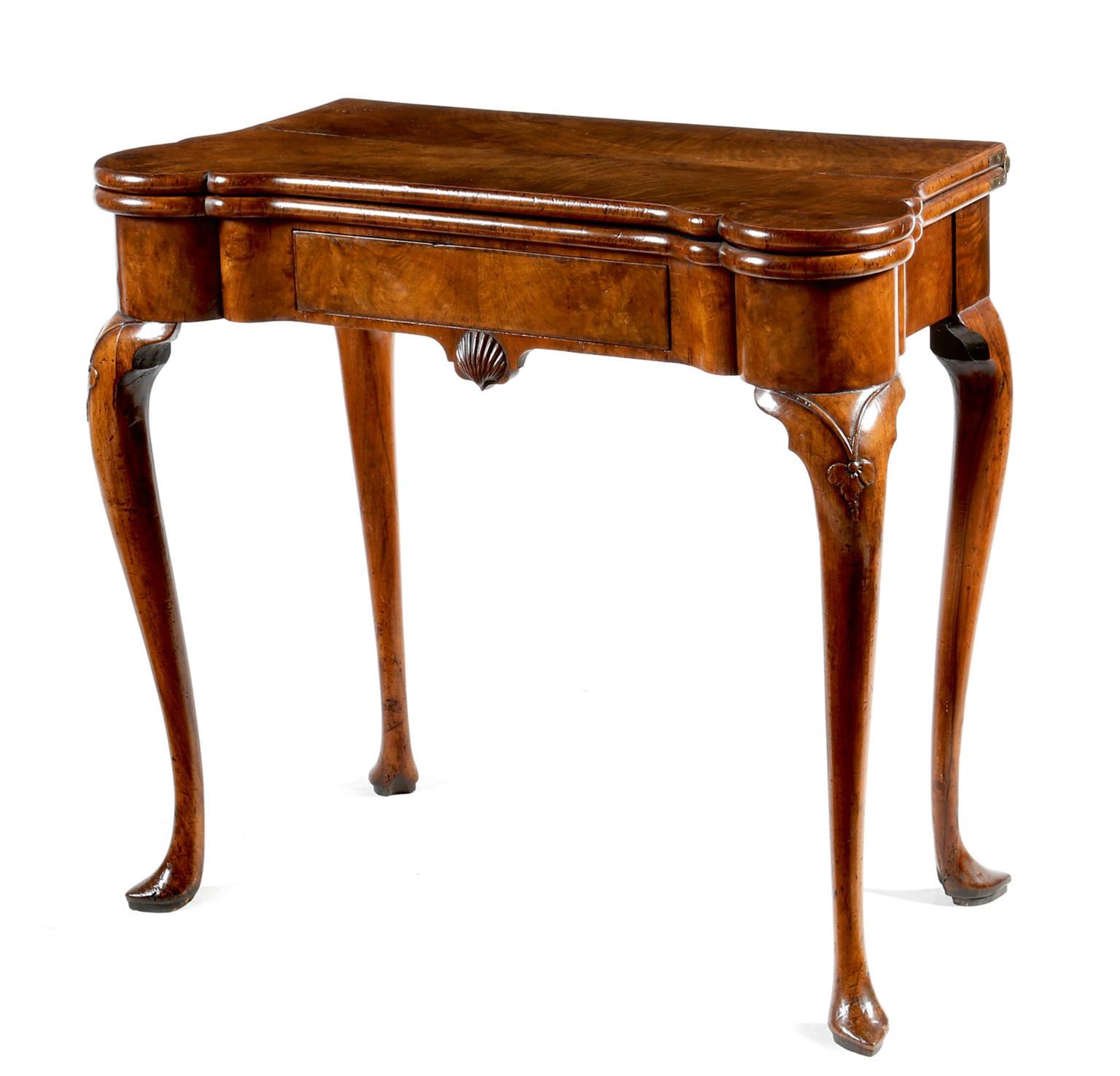 A George II walnut concertina action card table, the hinged fold-over top with protruding front corners, revealing a baize lined playing surface with dished counter wells and candlestands, fitted with a frieze drawer above an applied carved shell, on flower carved cabriole legs and pointed pad feet, possibly Irish, 73.3cm high, 81.4cm wide, 40.8cm deep.