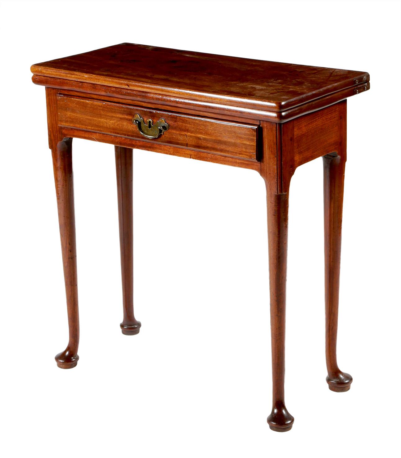A small George II mahogany tea table, the solid top on a single gate support, with a frieze drawer, on turned club legs and pad feet, 72.7cm high, 68.9cm wide, 24.5cm deep.
