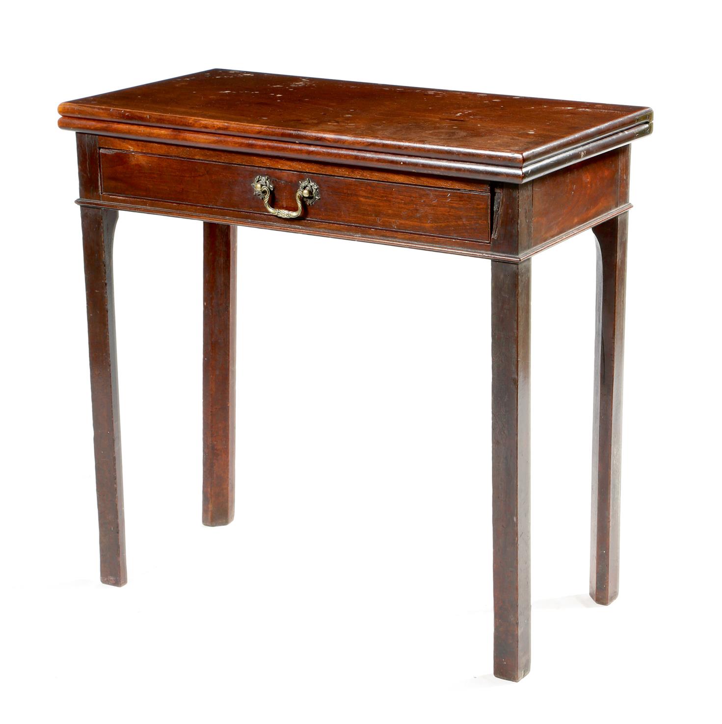 An early George III mahogany tea table, the solid top above a frieze drawer, with a cast brass swing handle with oak leaf and acorn back plates, on chamfered legs, 74.7cm high, 76.7cm wide, 38.2cm deep.