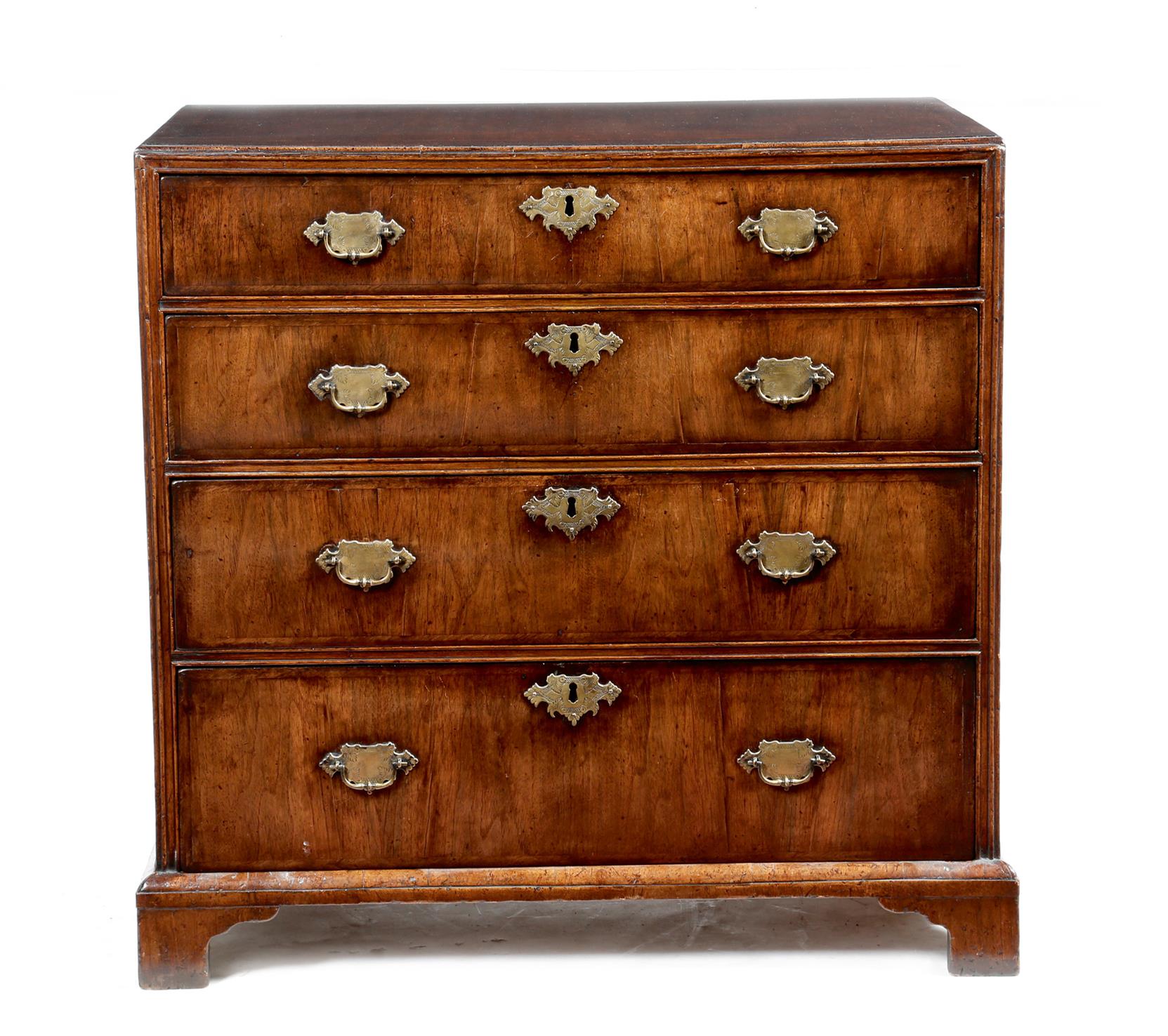 A George II walnut chest, cross and feather banded, the top with a caddy moulded edge, above four long graduated drawers, 76.5cm high, 79.5cm wide, 49cm deep.