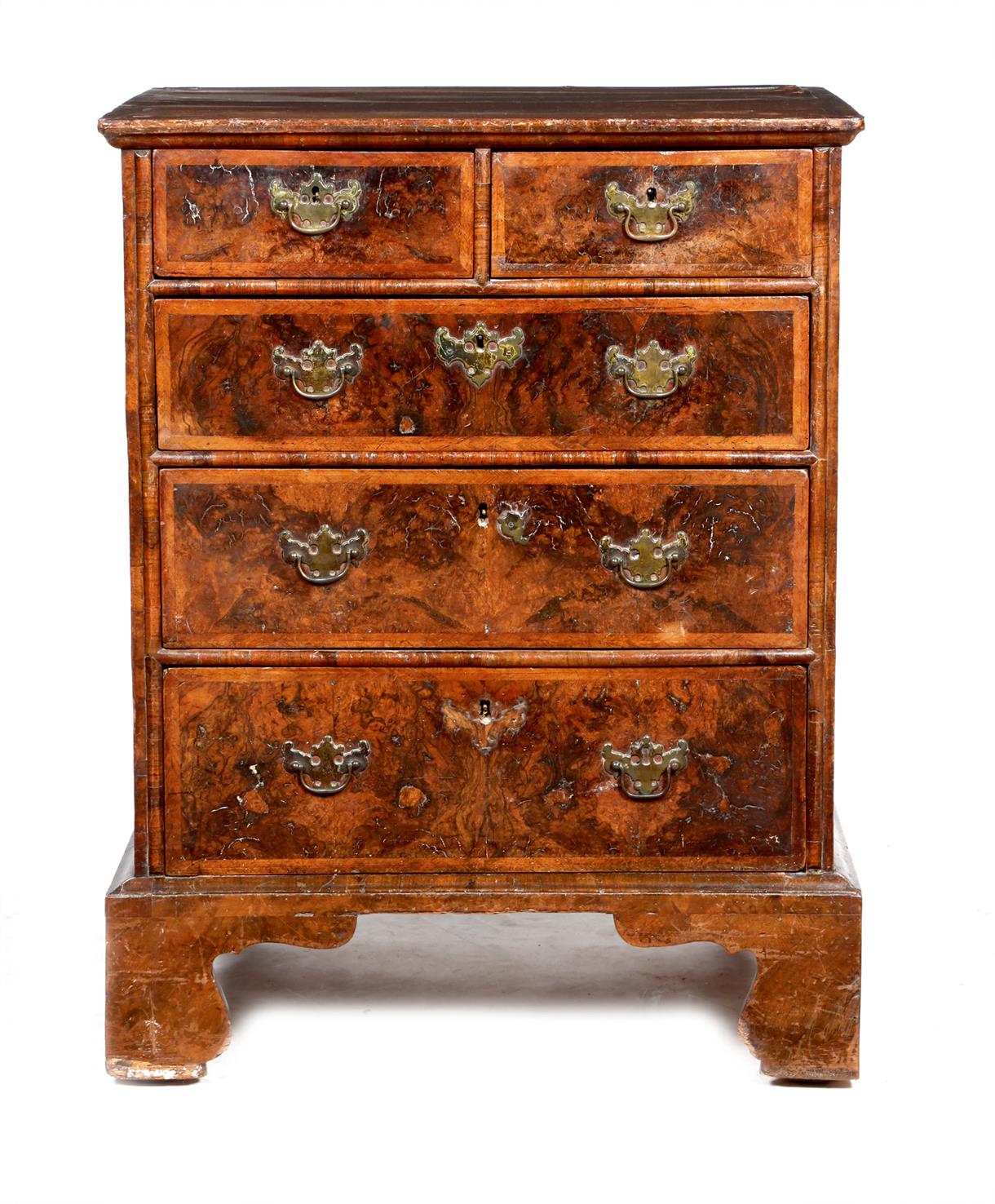 A small 18th century and later walnut chest, with cross and feather banding, the quarter veneered top above two short and three long drawers and bracket feet, 84.7cm high, 65.7cm wide, 47cm deep.