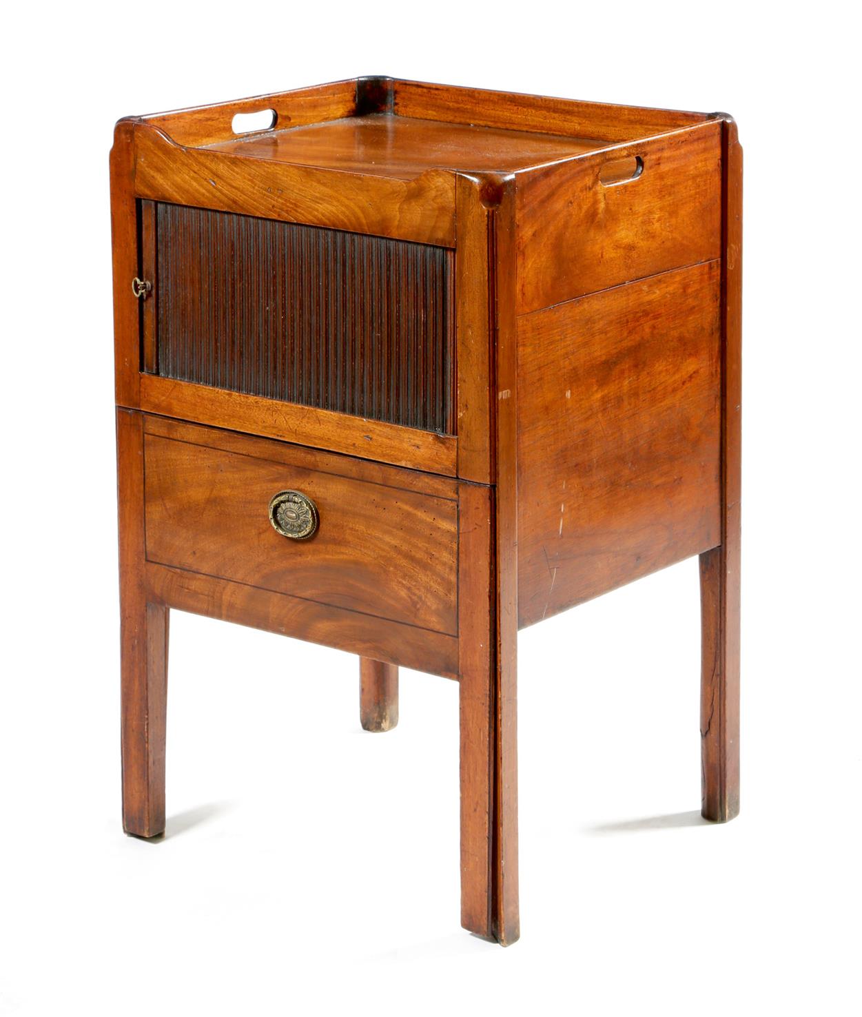 A George III mahogany tray-top bedside commode, the gallery pierced with a pair of handgrips above a tambour shutter and a converted pull-out base, 77.1cm high, 49.4cm wide, 43.3cm deep.