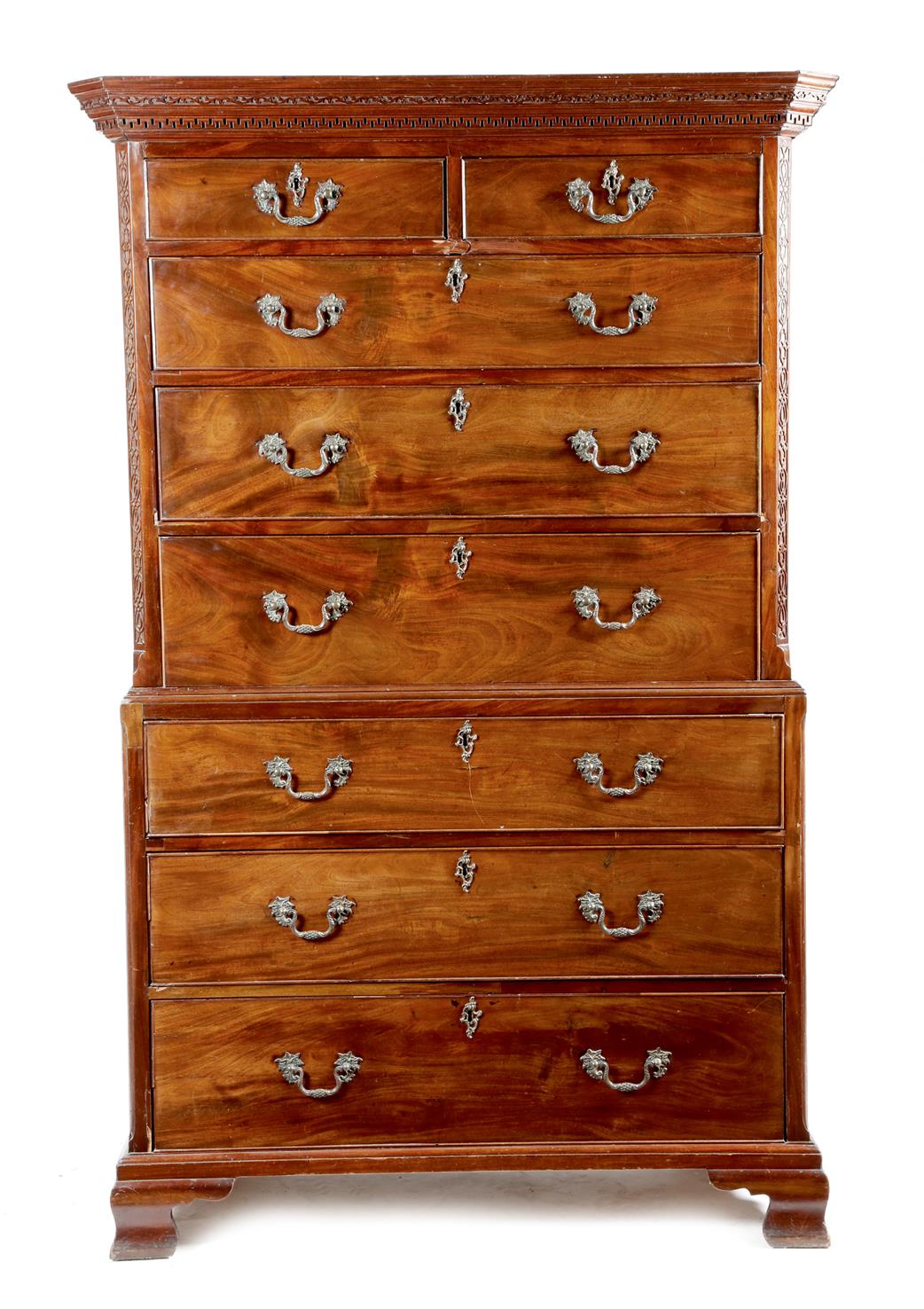 A George III mahogany chest on chest, the moulded cornice with a blind fret frieze and Greek key mouldings, above two short and three long drawers, flanked by blind fret angles, the base with three long drawers, all fitted with brass Rococo handles and leaf and flower backplates, 174cm high, 112cm wide, 56cm deep.