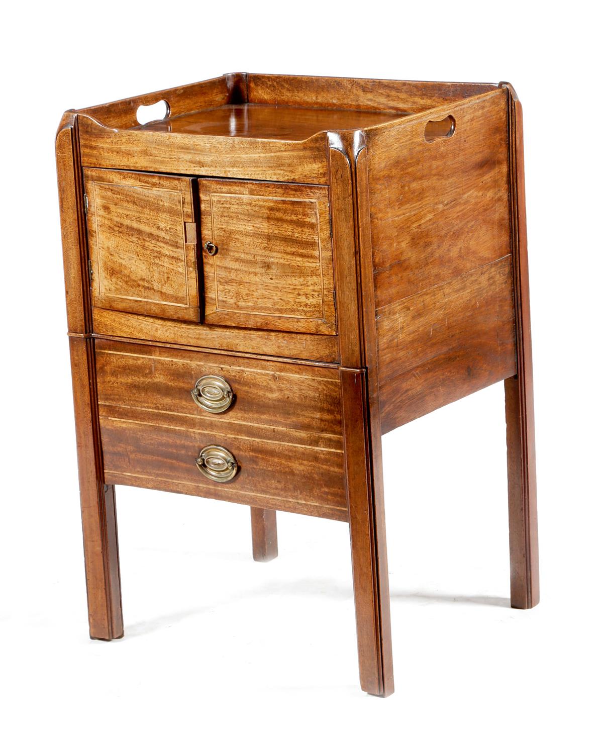 A George III mahogany tray-top bedside commode, inlaid with stringing, the gallery pierced with two handgrips, above a cupboard and a converted pull-out base with a leather lined surface, 75cm high, 48.6cm wide, 42.7cm deep.