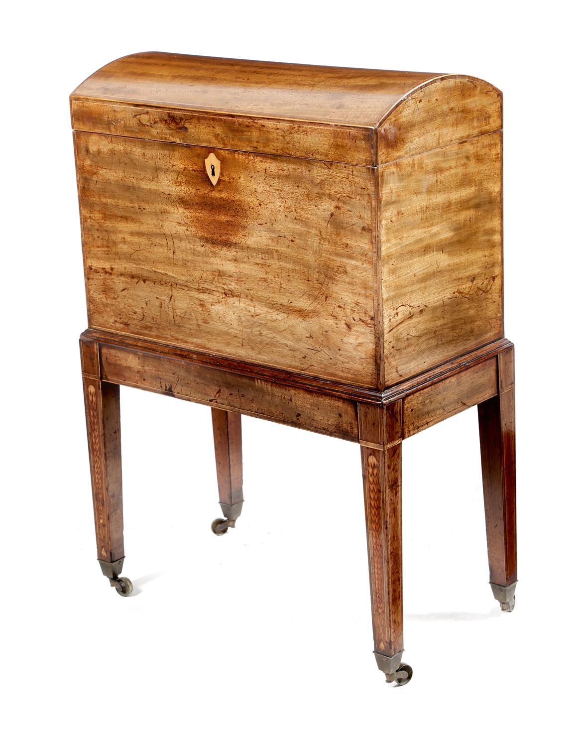 A George III rectangular cellaret, inlaid with stringing, with a domed lid, the interior with eight divisions, on husk inlaid square tapering legs and brass caps and castors, the underside with a paper label inscribed 'DENYS WREY LTD, Dealers in XV111 Century English Furniture No. 45 Sloane Street, S. W. 1.', 75.7cm high, 52.9cm wide, 28.8cm deep.