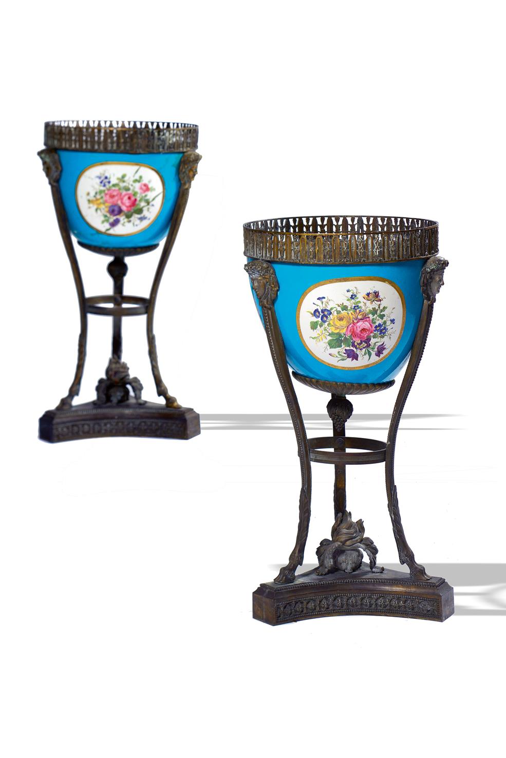 A pair of 19th century French bronze and Sèvres style porcelain jardinières in Louis XVI style, in the form of classical athéniennes, each with a pierced laurel gallery above a bleu celeste porcelain bowl painted with panels of flowers with gilt borders, each with an integral liner and tripod classical male mask and hoof monopodia supports, with a bud pendant and a flaming finial, 63.2cm high. (2)