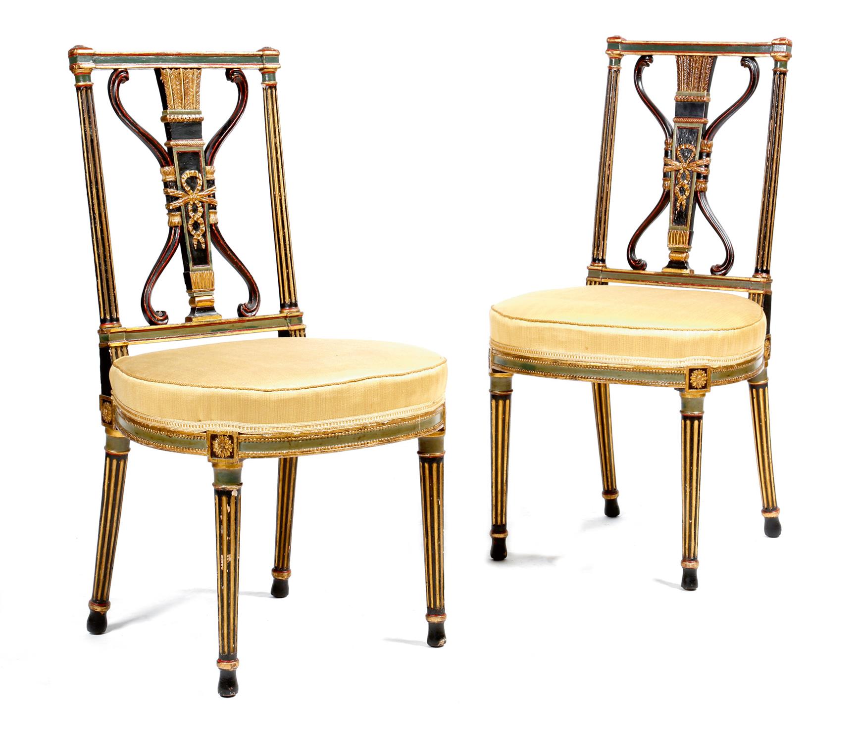 A pair of late 18th century painted side chairs, with parcel gilt and ebonised decoration, each with a fluted column and moulded back and a ribbon tied quiver of arrows and archer's bow back, above a stuffed-over seat on fluted tapering legs, each with a paper label inscribed 'ARTHUR N. GILBEY'. (2)