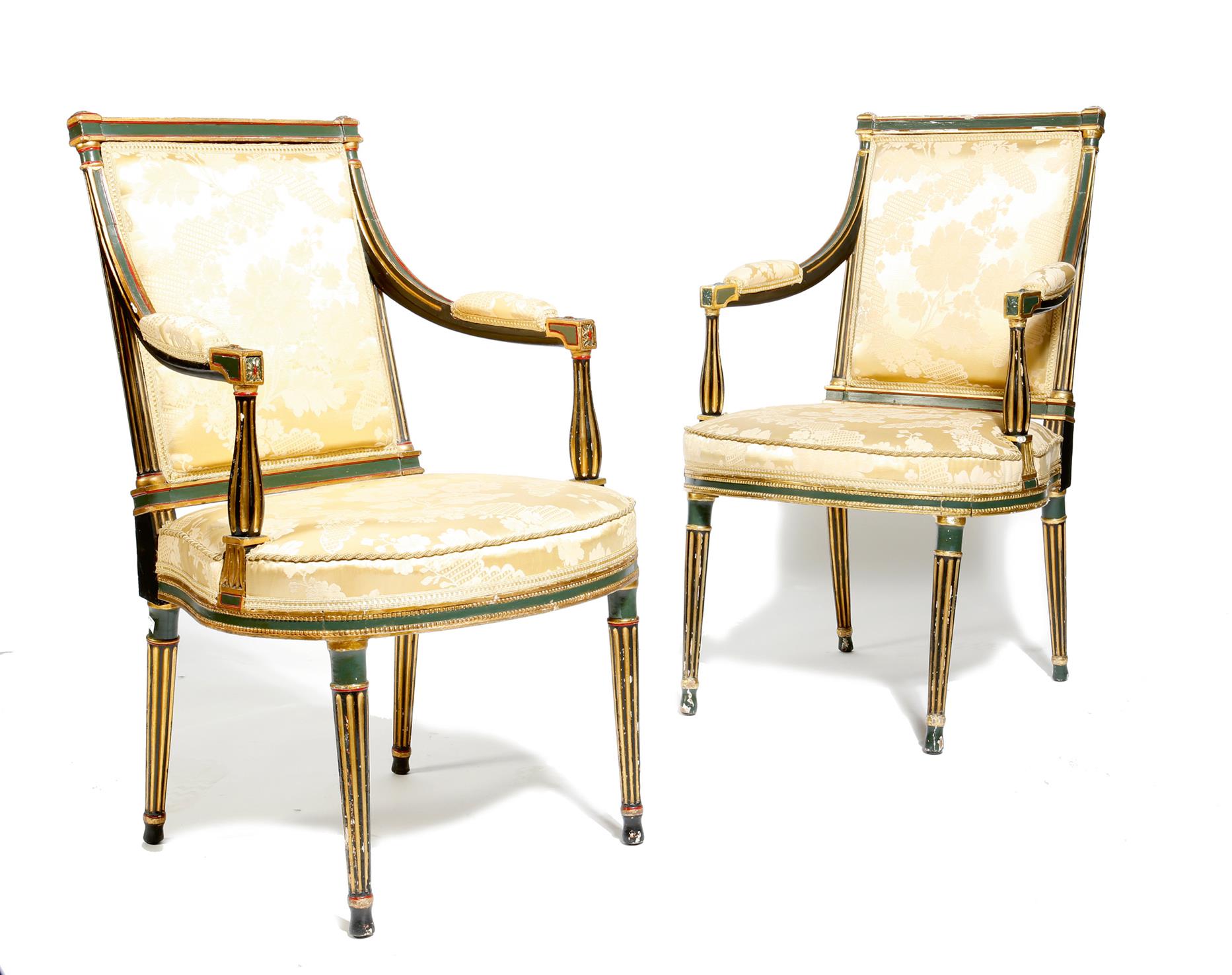 A pair of late 18th century painted fauteuil, with parcel gilt and ebonised decoration, each upholstered in gold damask fabric, with moulded and fluted frames on tapering legs, each with a paper label inscribed 'ARTHUR N. GILBEY', slight differences to paintwork. (2)