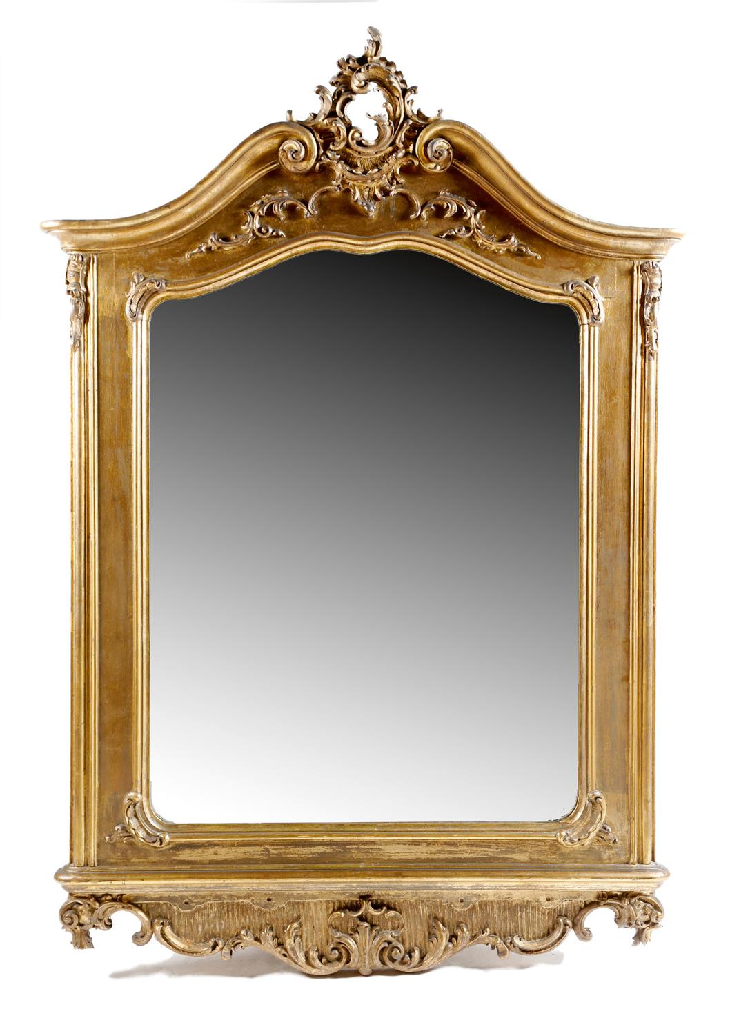 A Louis XV style giltwood wall mirror, the shaped plate within a moulded frame decorated with scrolls, leaves and rocaille, 154 x 107.1cm.