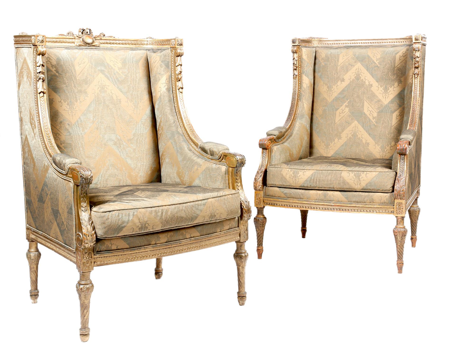 A matched pair of Louis XVI style giltwood bergères