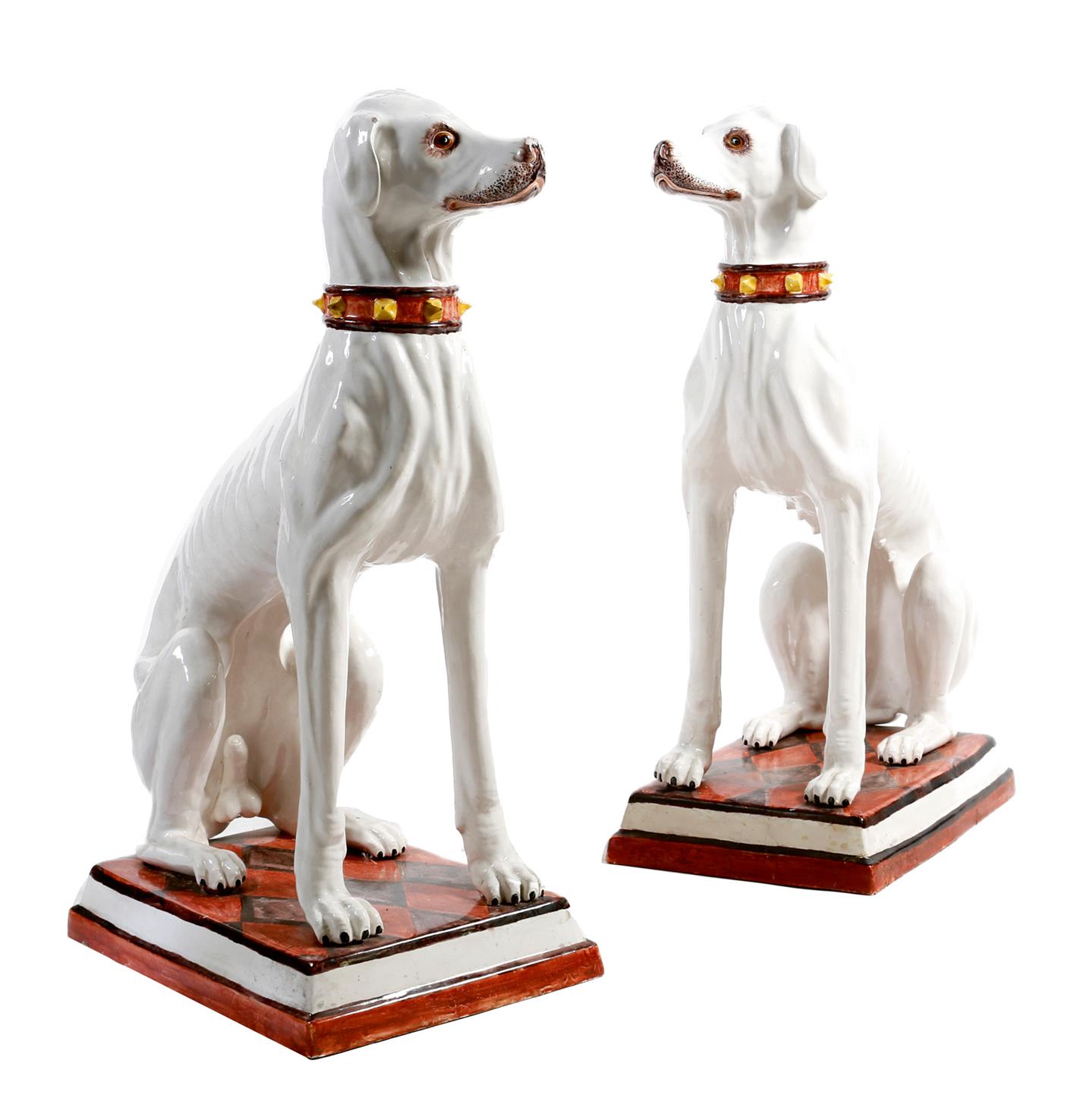 A large pair of faïence pottery models of seated dogs, each with a studded collar, raised on a plinth base, 99.8cm high, 71cm long. (2)