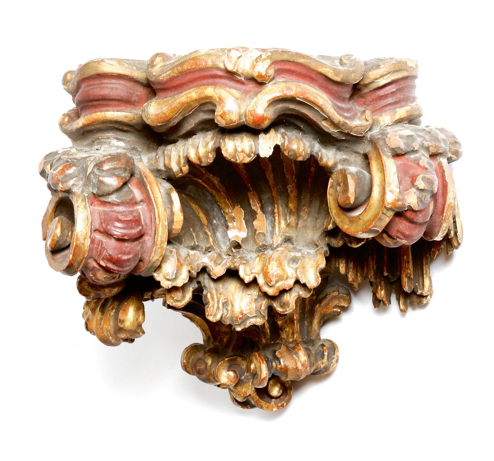 A giltwood and polychrome decorated wall bracket, of shell and scroll form, probably Italian or Spanish 18th century, 31.5cm high, 35.5cm wide.