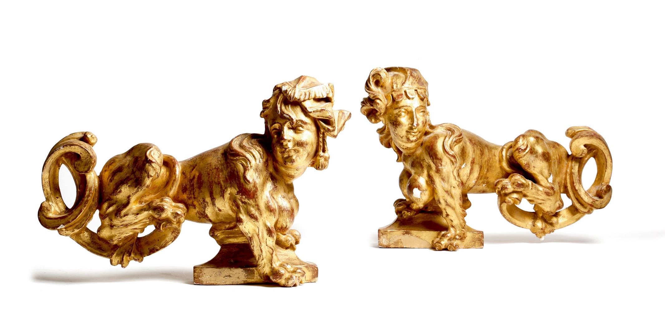 A pair of Rococo style gilt plaster models of sphinxes, the part female and part lion creatures wearing a headdress, the hind legs on scroll supports, possibly Italian 18th century, 28.7cm high, 35.5cm long. (2)