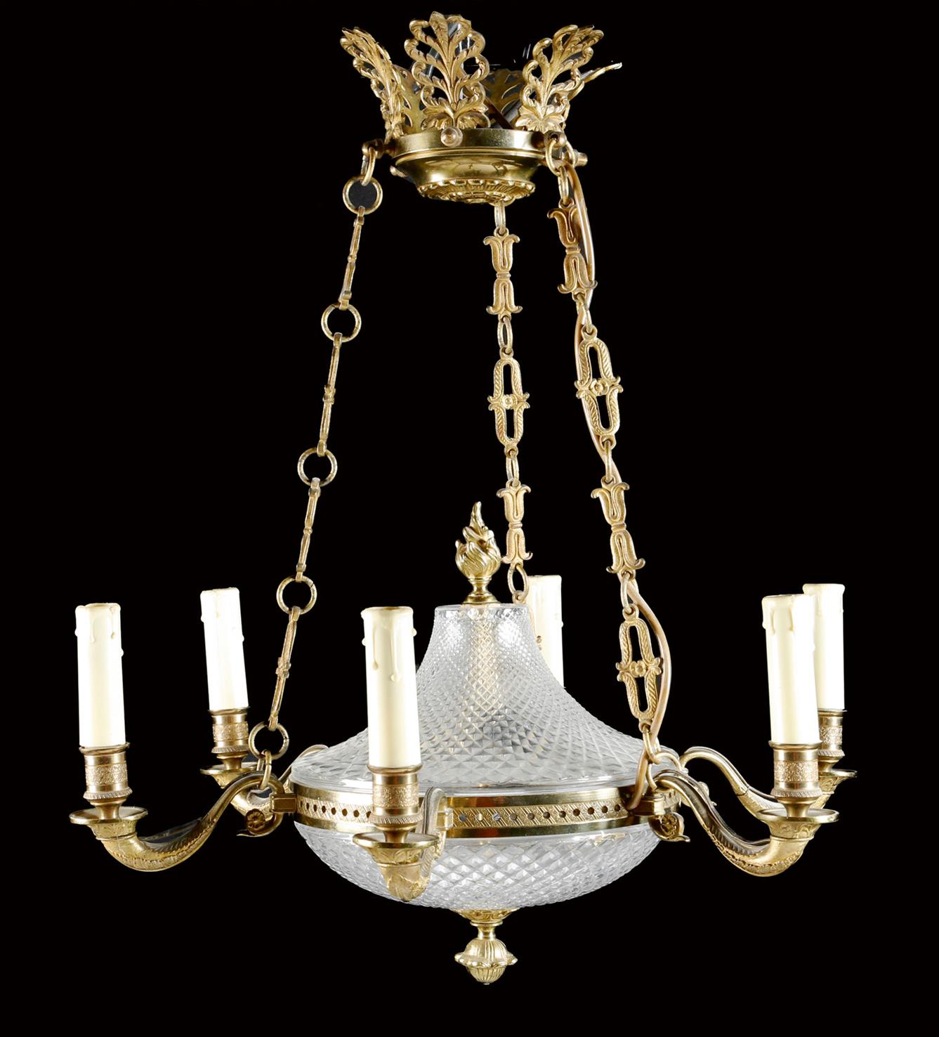 A French Empire style gilt brass and glass six-light chandelier, with an anthemion corona, a flaming urn finial and a bud pendant, 57.5cm high, 51cm wide.