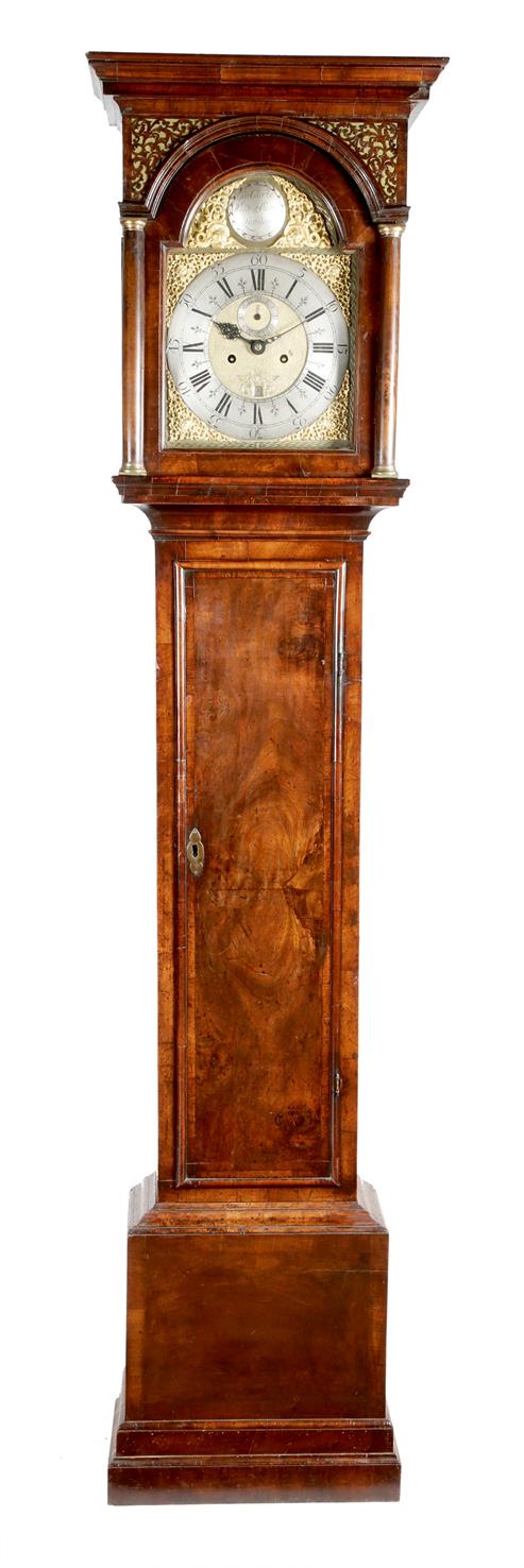 A walnut longcase clock, the eight day movement with five turned pillars and an anchor escapement striking on a bell, with a 12in arched dial with engraved feather banding and gilt spandrels, with a silvered chapter ring with Roman and Arabic numerals, with a subsidiary seconds dial and date aperture, the arch with a silvered rondel inscribed 'Geo Clarke, White Chappel, London', the hood with fretwork spandrels and turned columns above a crossbanded case, 226.3cm high.