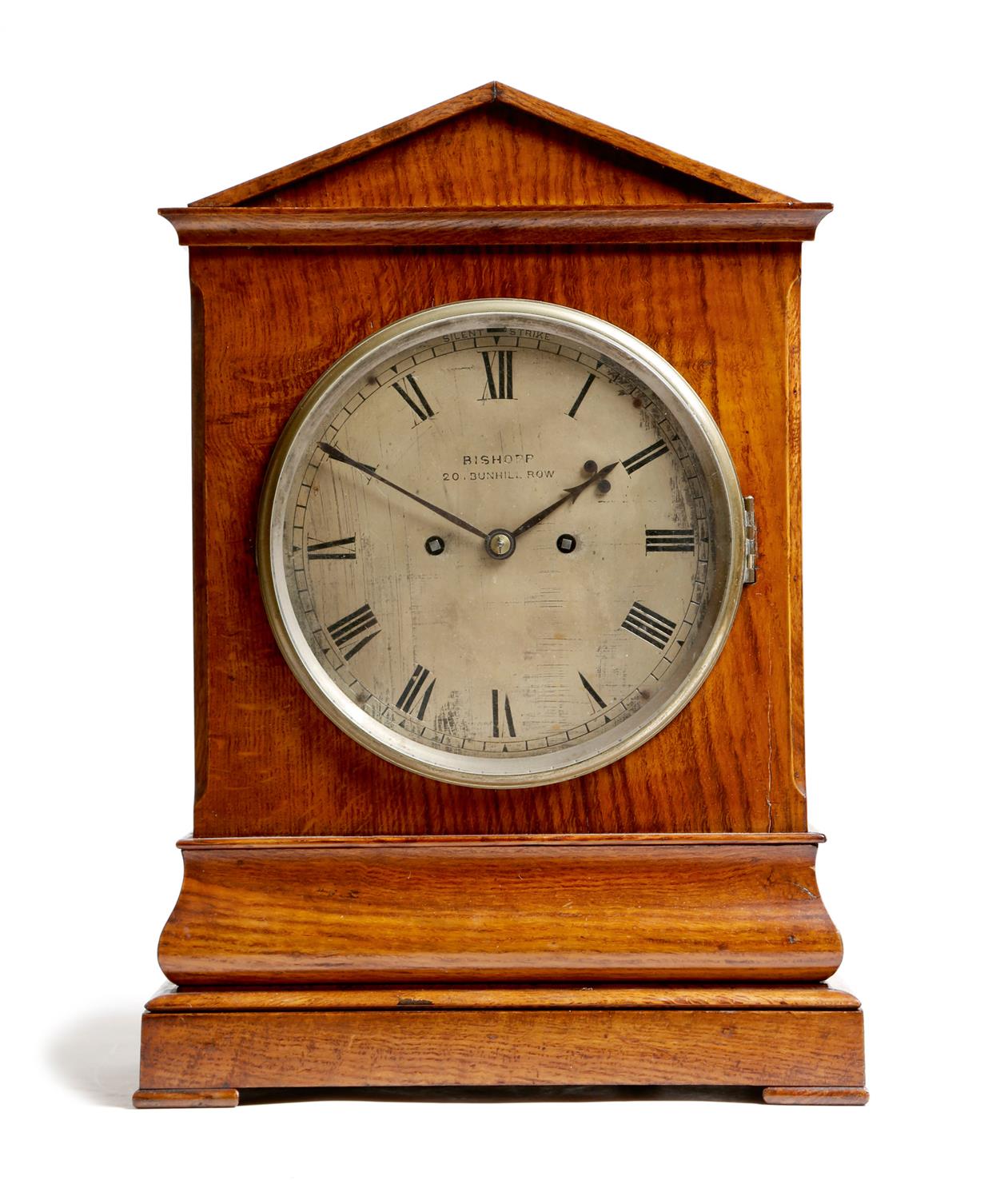 A Victorian oak mantel clock, the eight day twin train movement striking on a gong, with a silvered dial, with Roman numerals and a 'Silent Strike' switch and inscribed 'BISHOPP, 20, BUNHILL ROW', in an architectural case with fishscale panelled sides, 46cm high, 32.7cm wide.