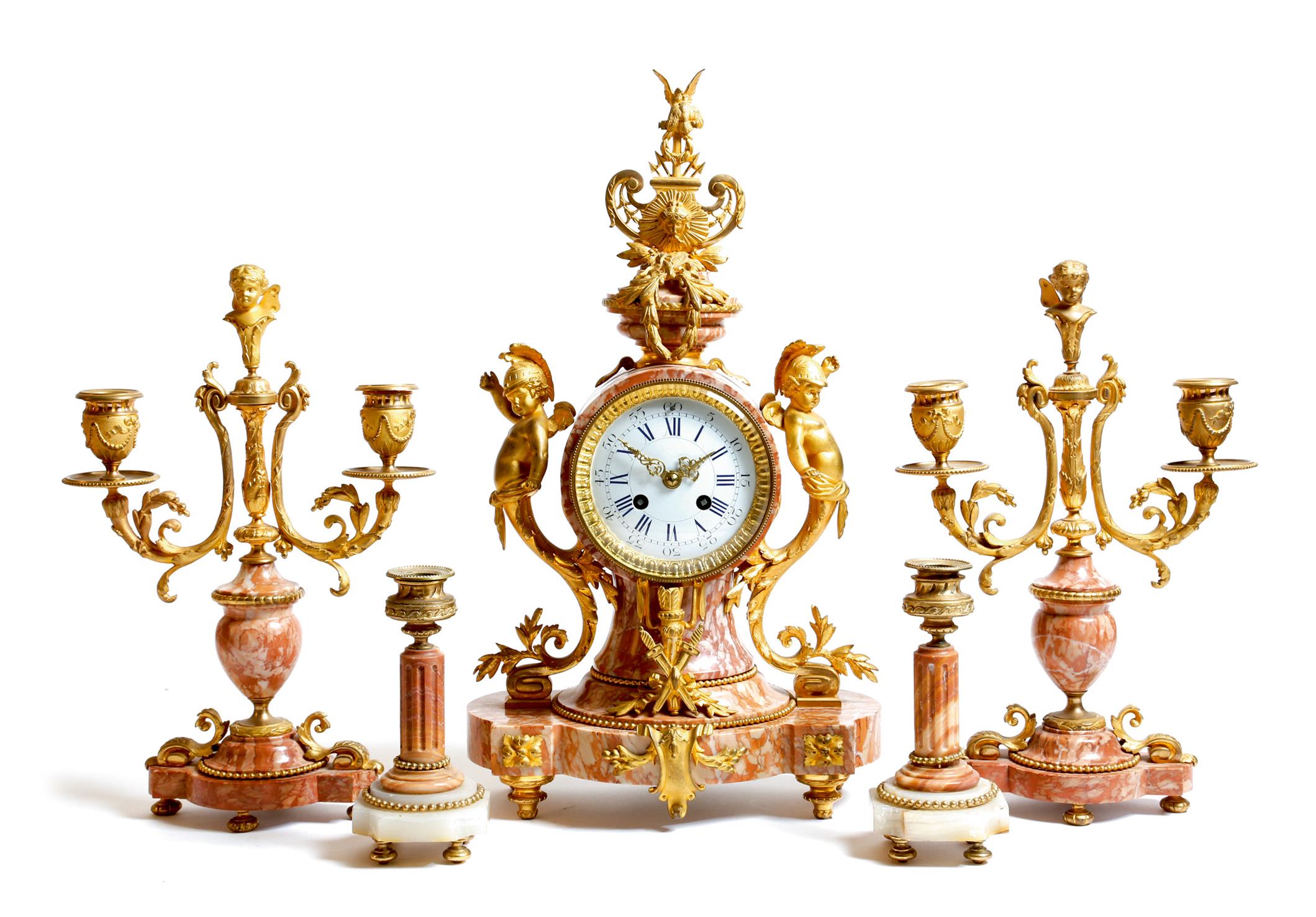 A French pink breccia marble and ormolu mounted clock garniture in Louis XVI style, the eight day brass drum movement, with an outside countwheel, stamped 'H & K, PARIS 1996' and '83', with a white enamel dial with Roman and Arabic numerals, the case decorated with Mercury style cherubs, with a laurel wreath and war trophies, with a pair of matching twin-light candelabra and a pair of associated candlesticks, late 19th century, 45.5cm high. (5)