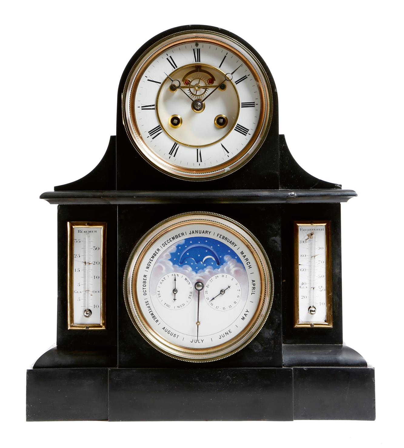 A late 19th century French black marble mantel clock, the eight day movement striking on a bell, the backplate stamped '3725 8', the white enamel dial with Roman numerals and a visible Brocot escapement to the recessed centre, above a calendar dial with subsidiary day and date dials and moonphase, flanked by a pair of thermometers, 39cm high 34.2cm wide.