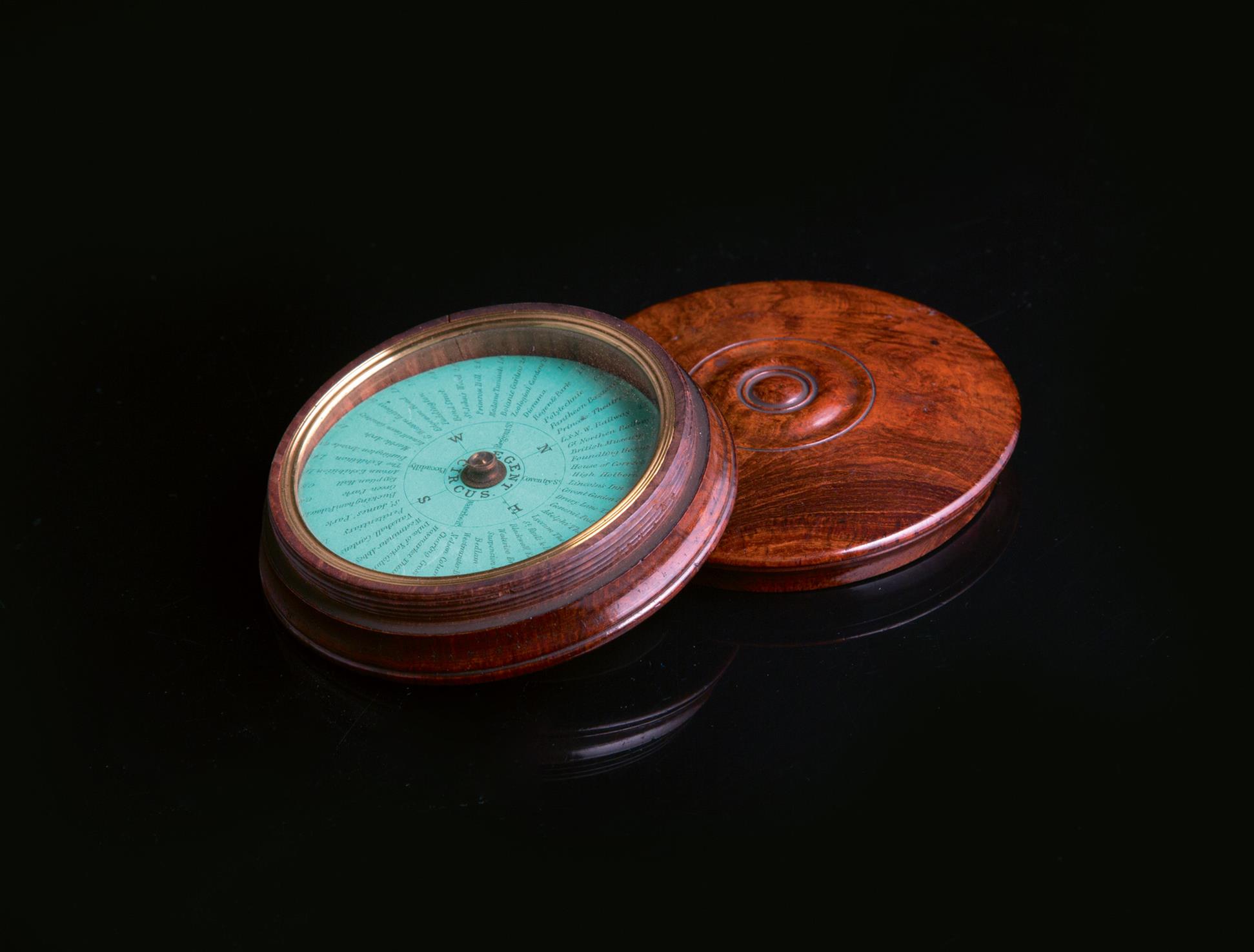 Great Exhibition interest. A rare Victorian mahogany pocket compass, the screw-off lid revealing a green card dial with various London landmarks emanating from Regent Circus with distance in miles, including: 'The Exhibition', 'African Exhibition', 'Egyptian Hall', the base with a cardboard insert inscribed in pen 'COMPASS MADE FOR VISITORS TO THE EXHIBITION IN HYDE PARK 1851', 8.2cm diameter.