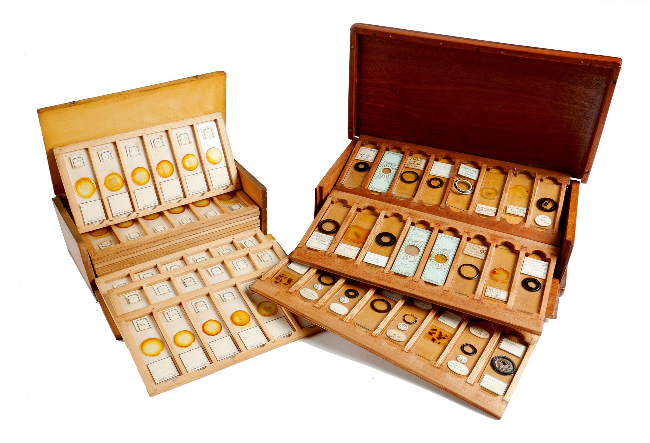 Two cases of microscope slides, some with labels for 'W. WATSON & SONS, 313 HIGH HOLBORN LONDON', including: 'Blood Discs of Toad', 'Wing of Butterfly', 'Human Skin Vertical Section', 'Human Spinal Cord'. 30.3cm wide. (2)