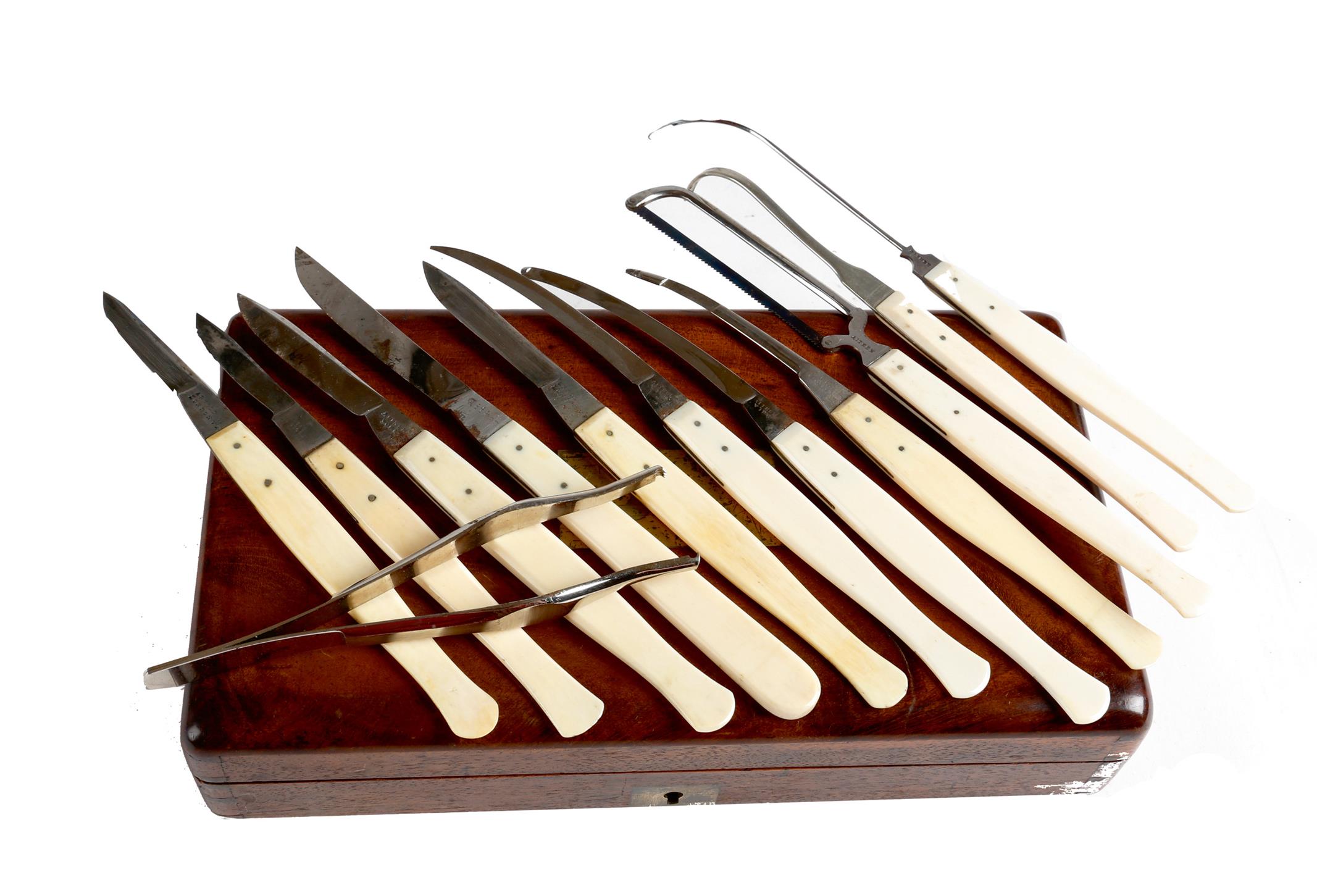 λ A Victorian mahogany case of surgeon's tools, the brass rack inscribed 'AITKEN YORK', with ivory handled tools, some inscribed 'AITKEN' the others 'ARNOLD, LONDON', 22cm wide.