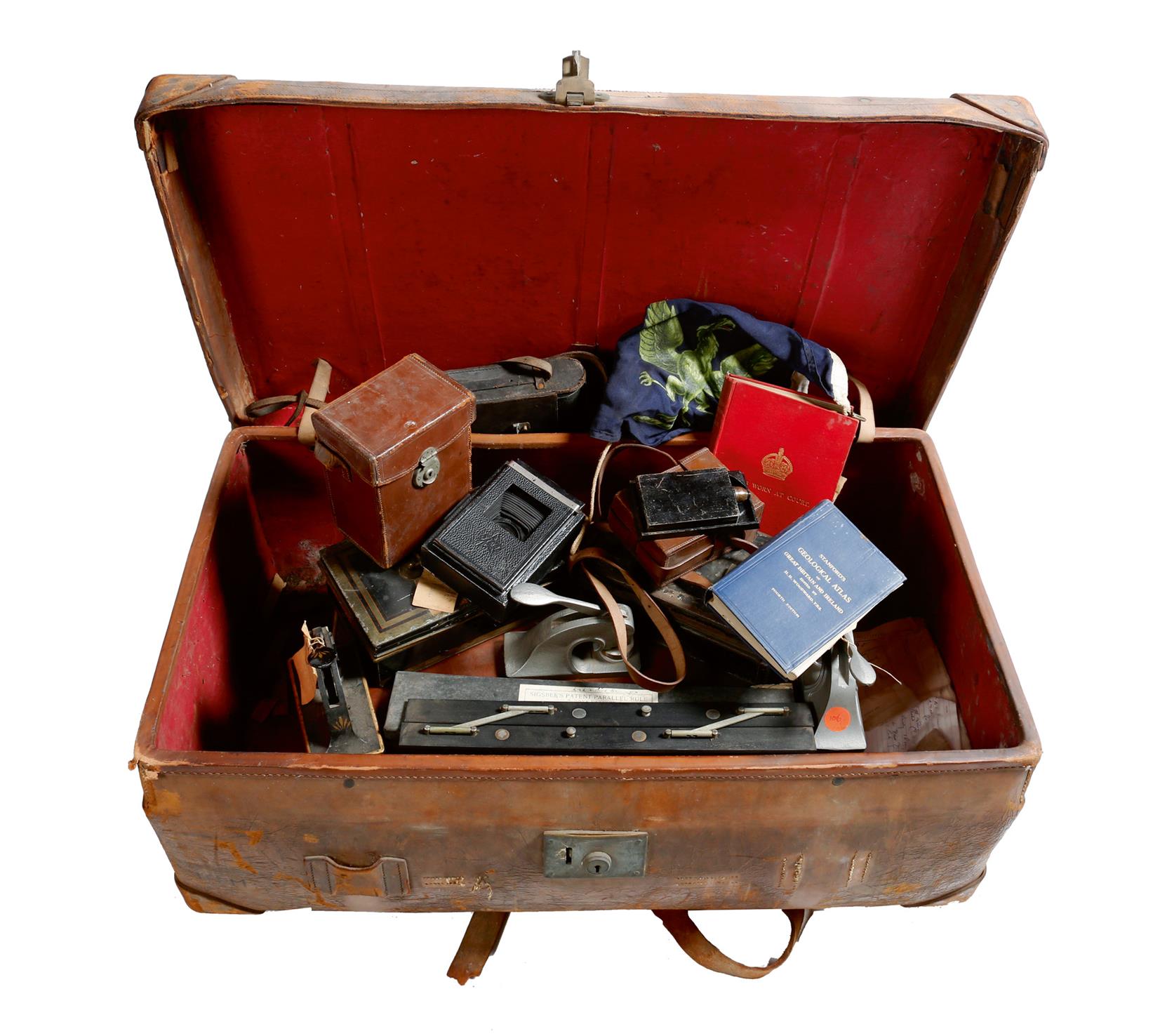A late Victorian brown leather travelling trunk, applied with old labels, the lid inscribed 'LORD TERENCE BROWNE', containing: two leather cased cameras one by Kodak, the other by TCA of Dresden, together with another case containing photographic equipment, a boxed parallel rule, various books including 'Visitation of England and Wales' volume 7, inscribed 'Lord Terence Browne February 5th 1912', Philips' 'Mercantile Marine Atlas of the World', two tin boxes and other items. (A lot)