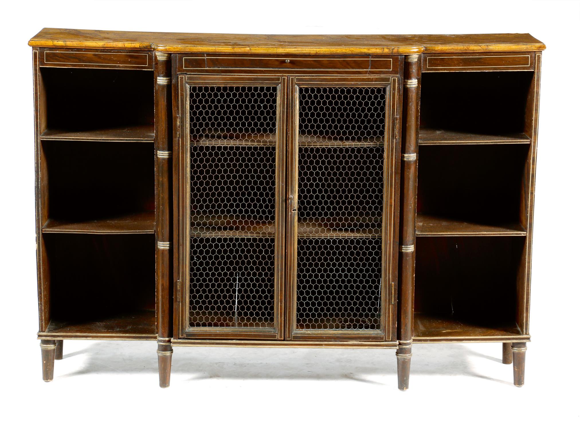 A Regency style simulated rosewood breakfront bookcase, with a faux marble top, above a central frieze drawer and a pair of grille doors enclosing two shelves, flanked by three open shelves to either sides, 89.8cm high, 127.9cm wide, 30cm deep.