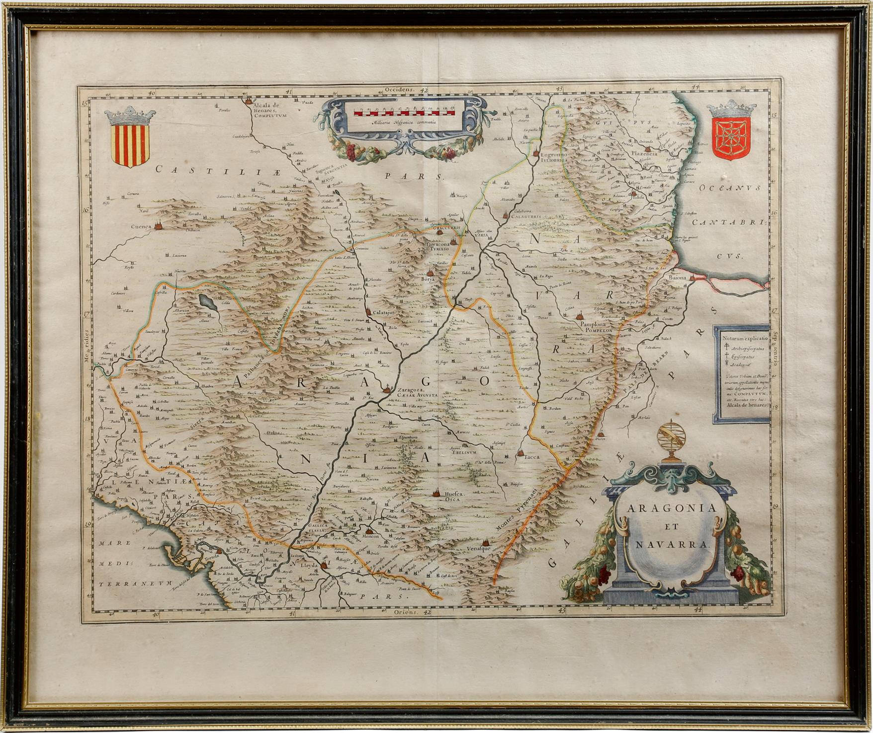 Willem and Joan Blaeu (Netherlands 1571-1638 and 1596-1673). A 17th century hand-coloured engraved map, inscribed 'ARAGONIA ET NAVARRA', 49.8 x 38.1cm, in a later glazed frame.