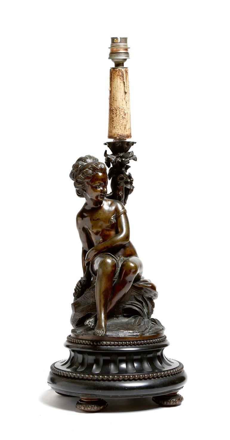 A French bronze figural lamp base, modelled with a scantily clad young maiden seated beside a tree, on a fluted black marble base, 36cm high (excluding fitting).