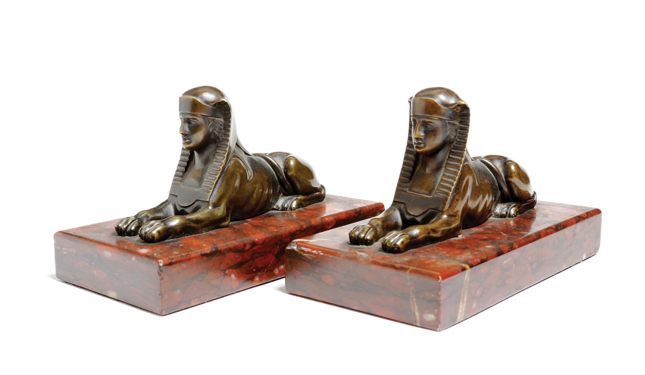 A pair of late 19th century French Egyptian Revival bronze and red marble paperweights, each modelled with a recumbent sphinx, 14.9cm wide. (2)