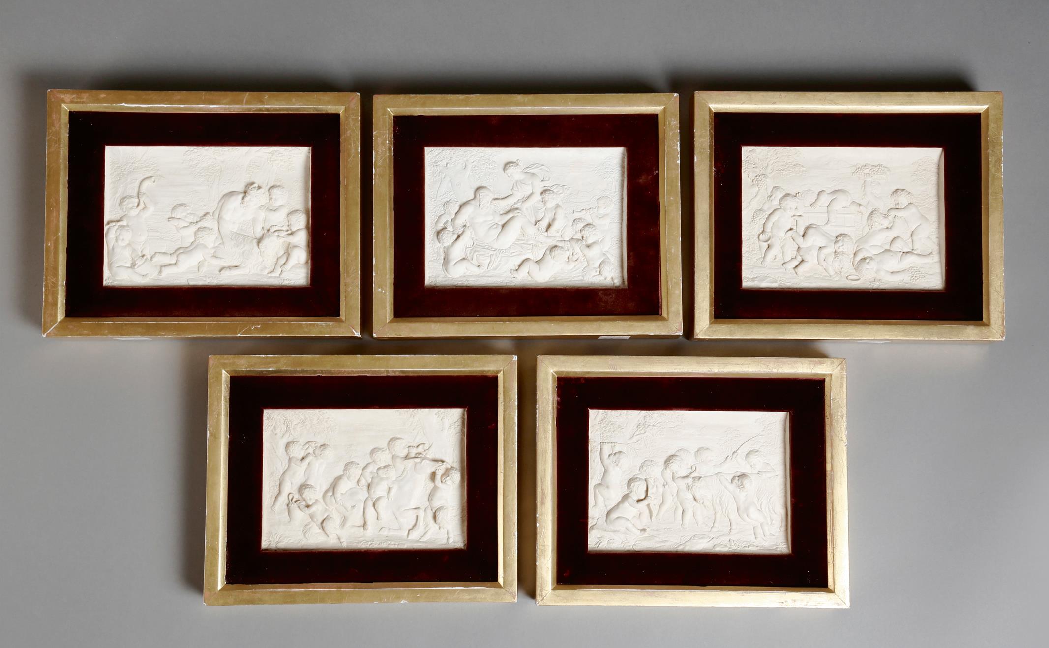 A set of five plaster relief plaques, depicting bacchanalian scenes, 10.7 x 15cm, each mounted in a plush and giltwood frame. (5)