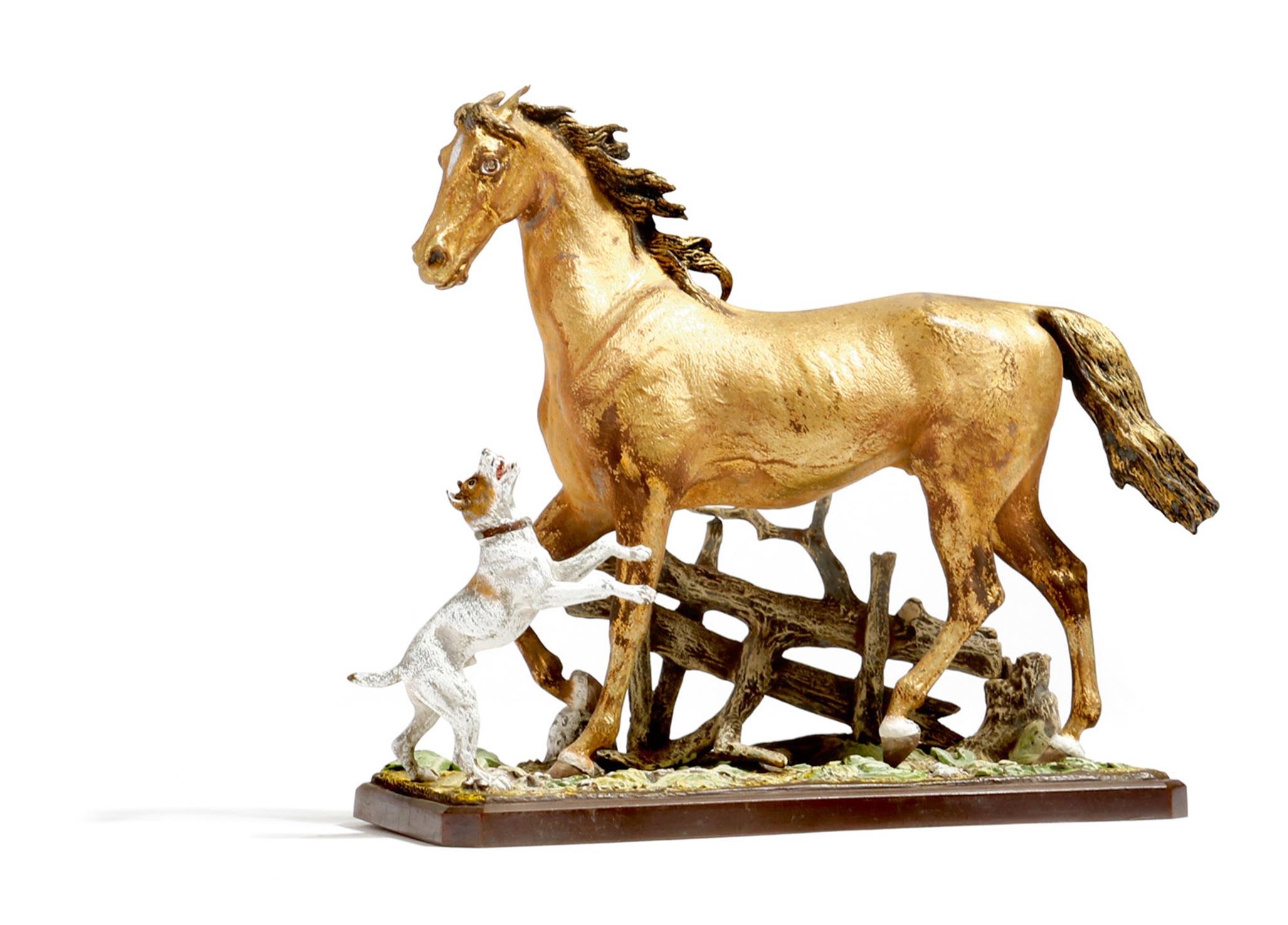 A cold painted bronze group of horse and a dog, on a naturalistic base, stamped with a 'B in a vase' twice and 'GESCHUTZT 3605', 18.1cm high, 22.8cm long.