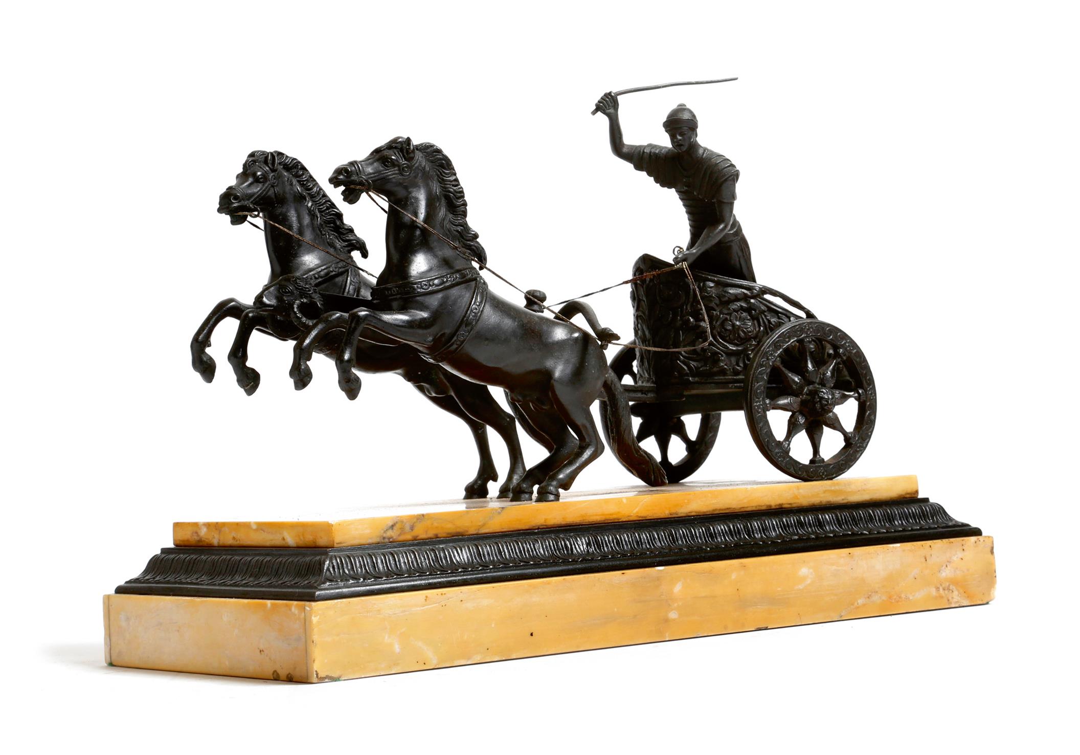 A 19th century bronze Grand Tour model of a Roman charioteer, with two horses, mounted on a Siena marble base, 33cm wide.