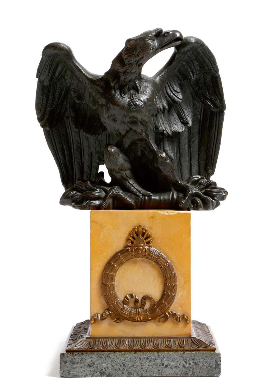 A 19th century French bronze Grand Tour model of an eagle, on a Siena marble plinth applied with a ribbon tied laurel wreath and on a green marble base, 35cm high.
