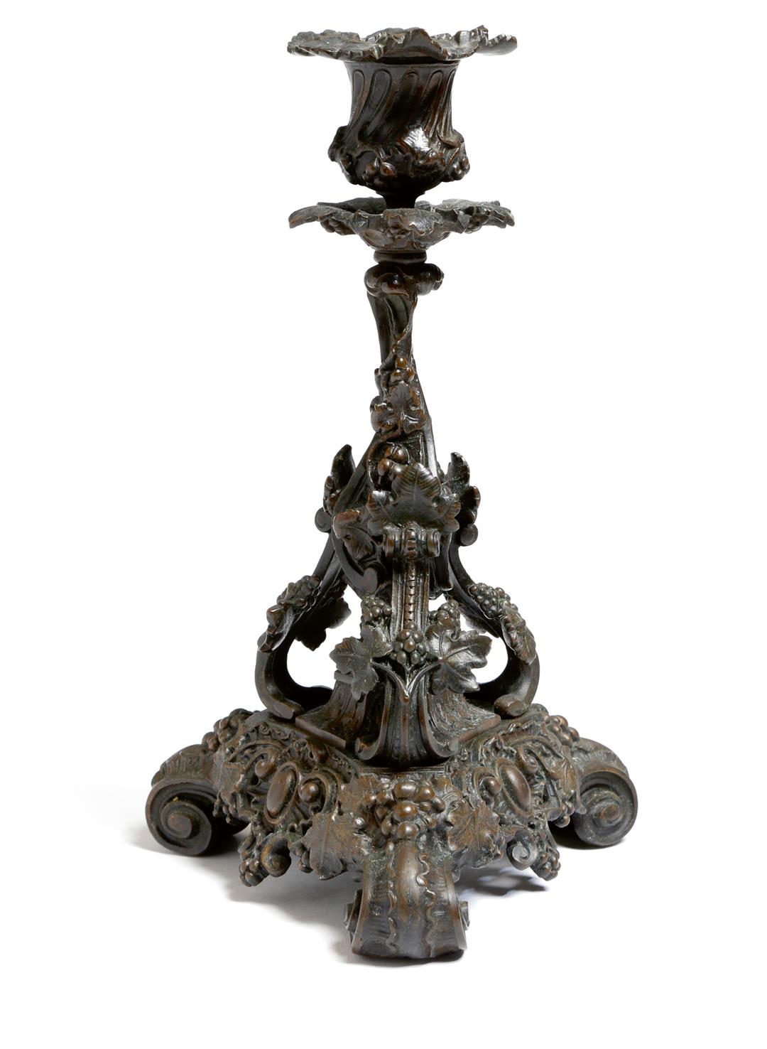 A late 19th century French bronze candlestick, naturalistically cast with grapevine, with a triform base and scroll feet, 23.2cm high.