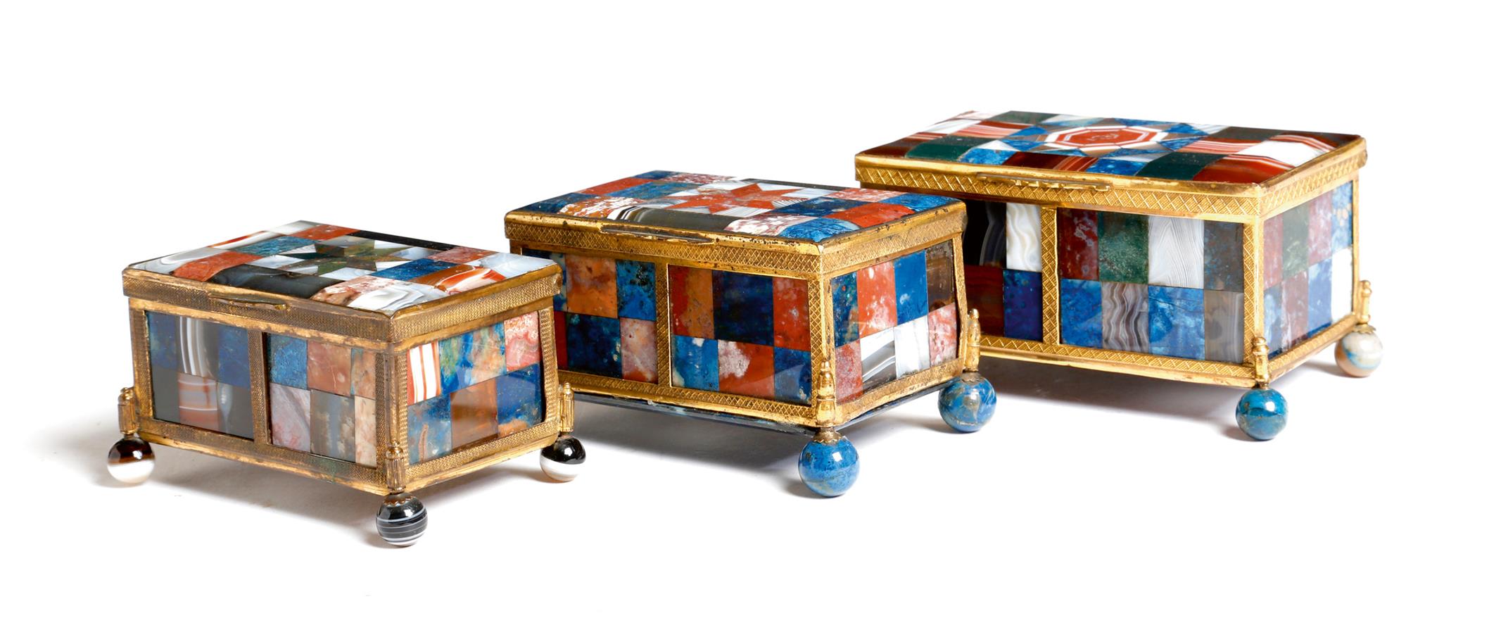 Three continental specimen agate and hardstone caskets, with gilt metal mounts, each with a star to the centre of the hinged lid and on ball feet, French or German, late 19th century, 10.7cm wide (max). (3)