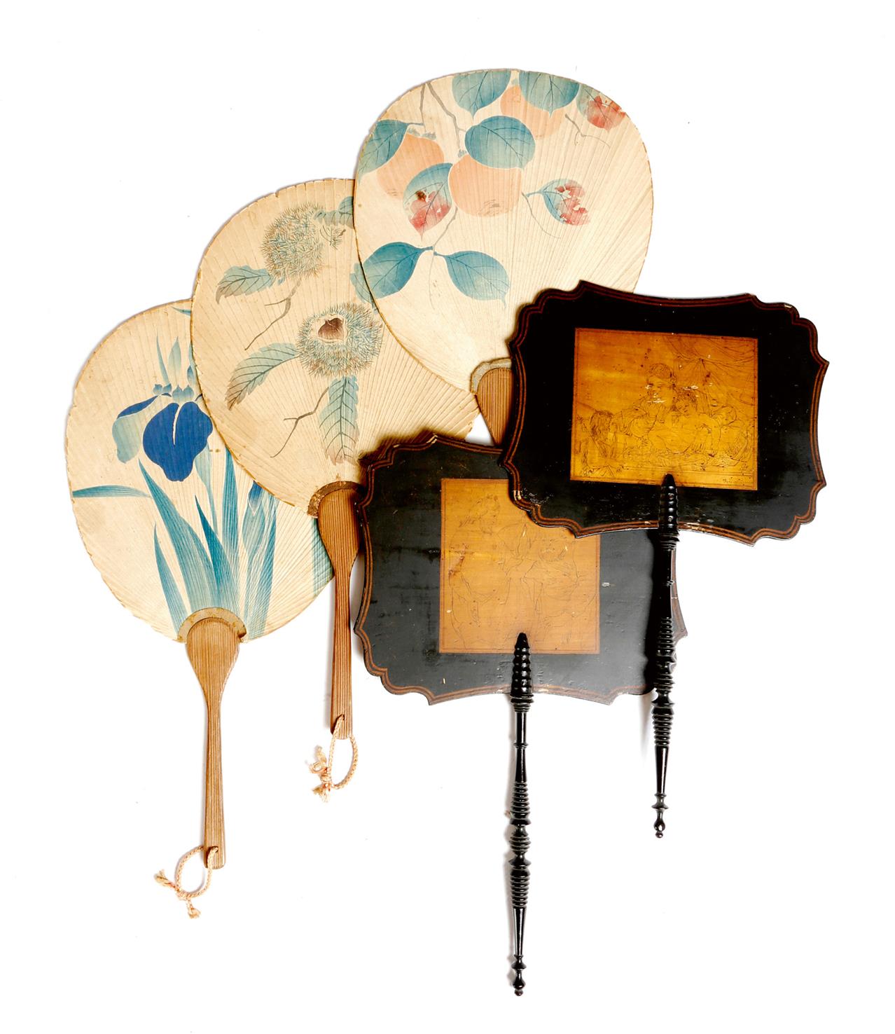 A pair of 19th century ebonised face screens, decorated with penwork drawings after Rubens and Anibale Carracci, with turned handles, together with three oriental paper and pine hand fans, 38cm long (max). (5)