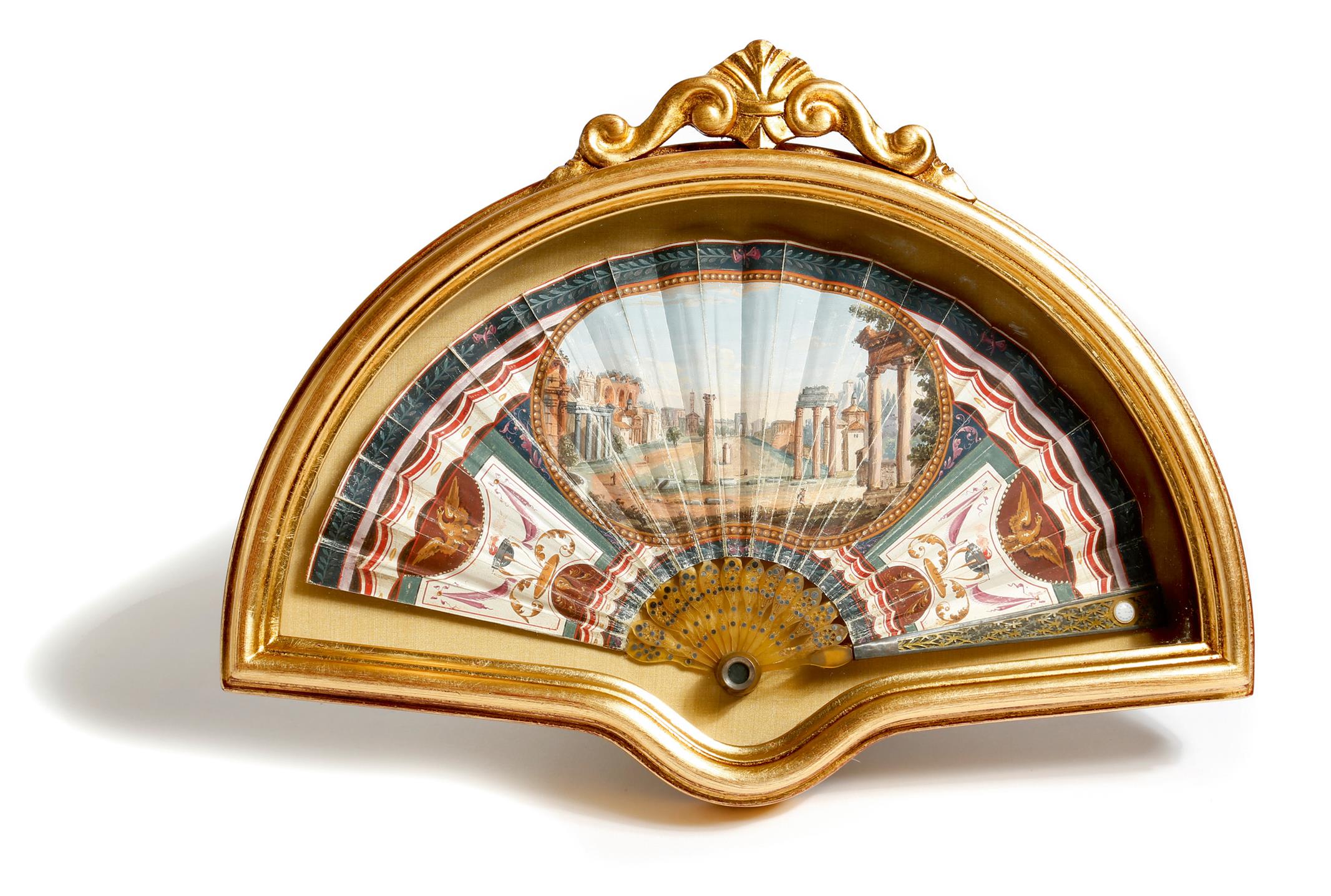 An Italian painted chicken skin Grand Tour fan, with probably horn sticks and guards, the guard with an enamel clock dial, the fan painted in gouache with a central scene of the Roman Forum, flanked by eagles and ribbon tied swags and urns, late 18th / early 19th century, 31.5cm wide, later mounted in a glazed display case.