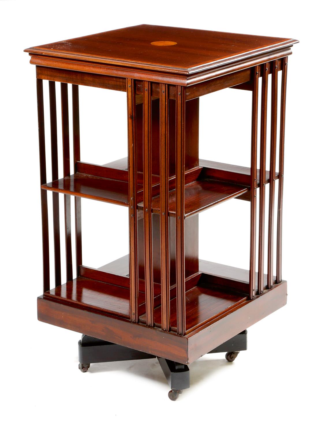 An Edwardian mahogany revolving bookcase, the top with satinwood banding and inlaid with a marquetry fan patera, on ceramic castors, 84.3cm high, 47.6cm wide, 47.4cm deep.