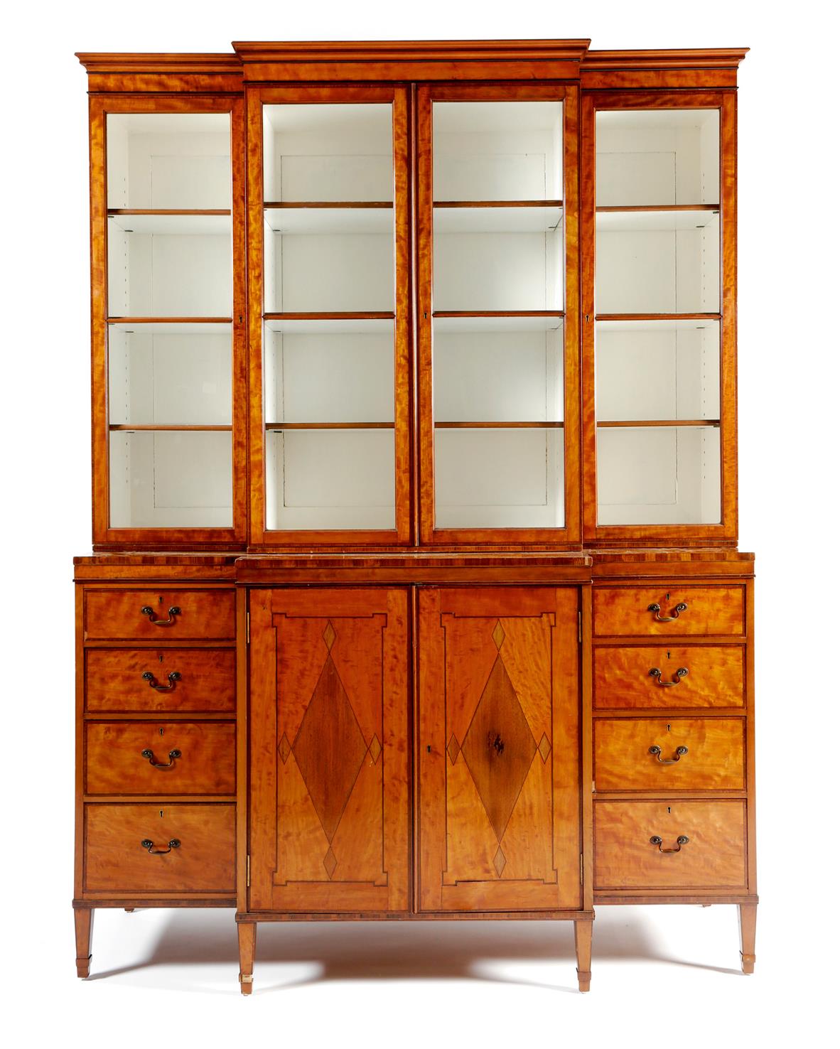λ An Edwardian satinwood breakfront bookcase in Sheraton style, with rosewood banding and ebonised edging, with a pair of astragal glazed doors flanked by further glazed doors, enclosing a white painted interior with adjustable shelves, the base with a pair of lozenge inlaid panel doors, enclosing adjustable shelves flanked by four drawers to either side, 206.4cm high, 154cm wide, 58.5cm deep.
