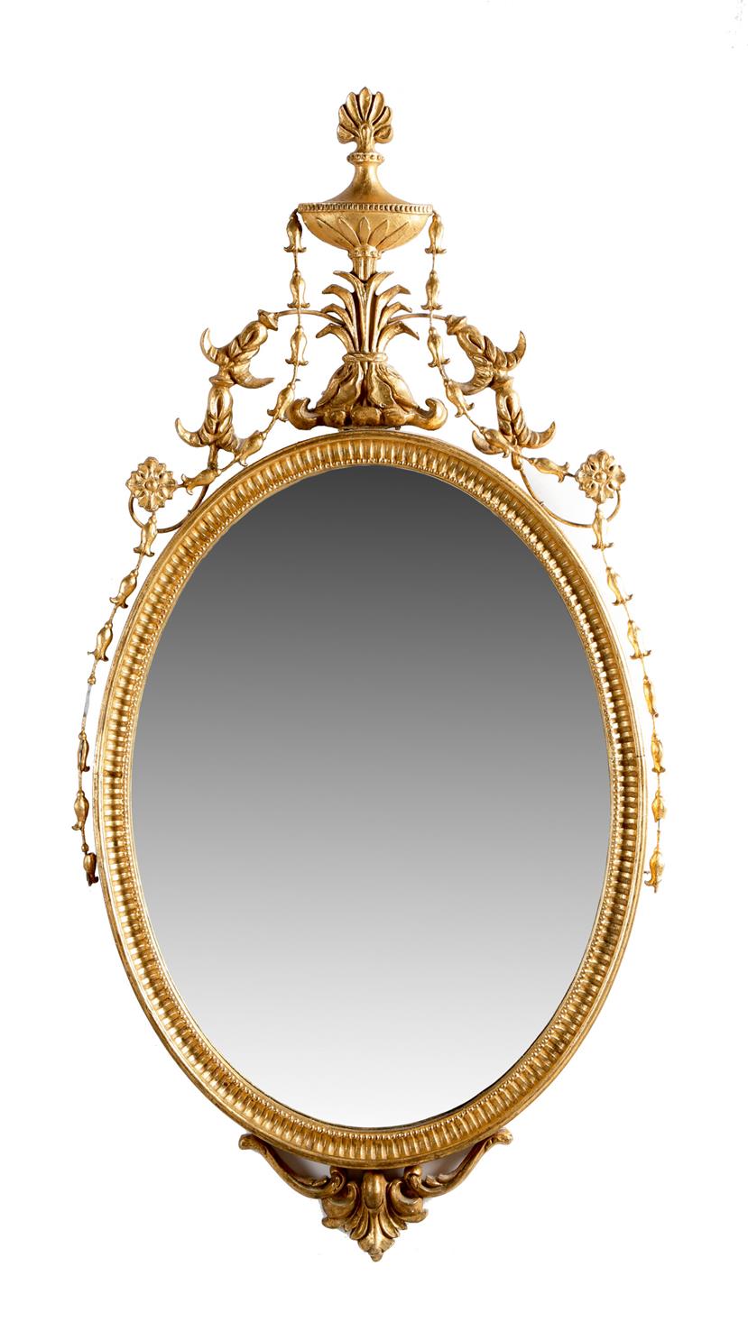 An Adam style giltwood wall mirror, with an oval plate within a fluted frame and with an urn surmount, 92 x 47cm.