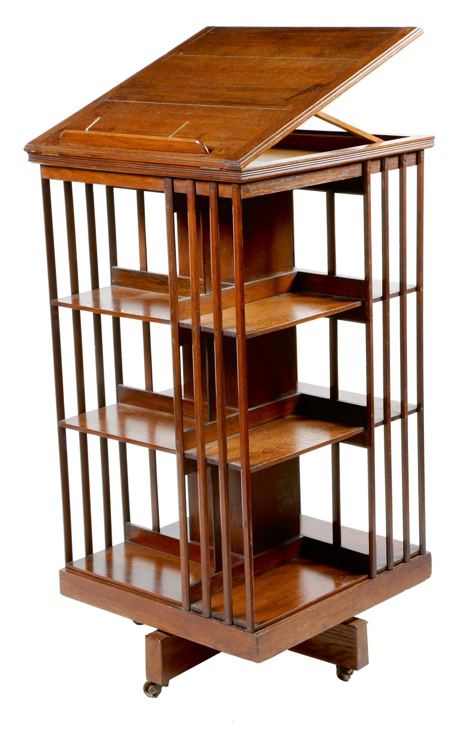 An Edwardian oak revolving bookcase, the hinged top with a ratchet and with a rest, with a metal trade label inscribed 'MATTHEWS & Co., ART FURNISHERS, Gloucester' on brass castors, 114.7cm high, 60.2cm square.
