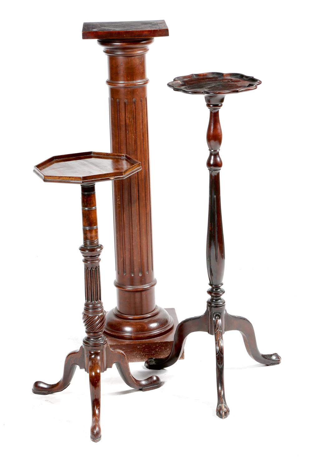 A stained beechwood fluted pedestal, together with two mahogany candlestands, one with an octagonal top, 106.7cm high (max) (3).